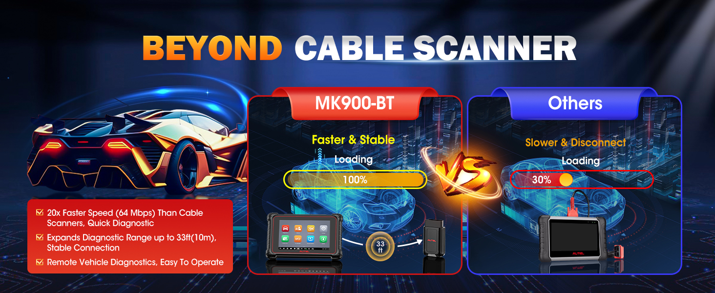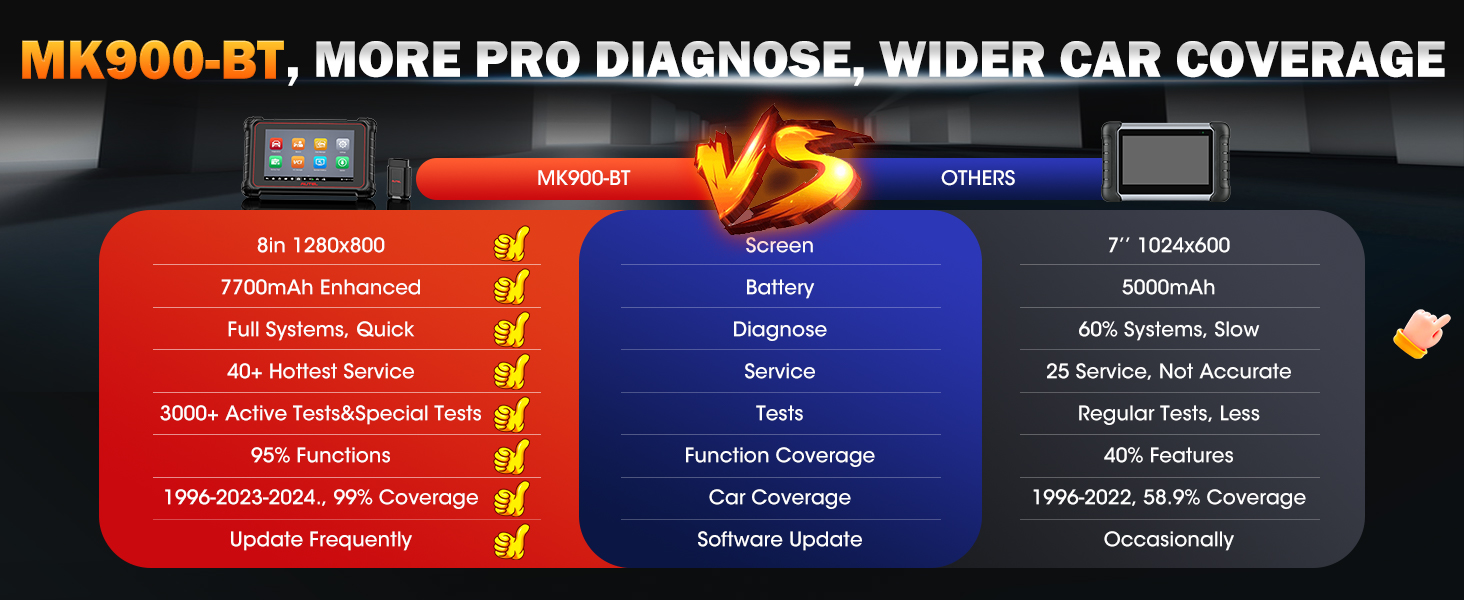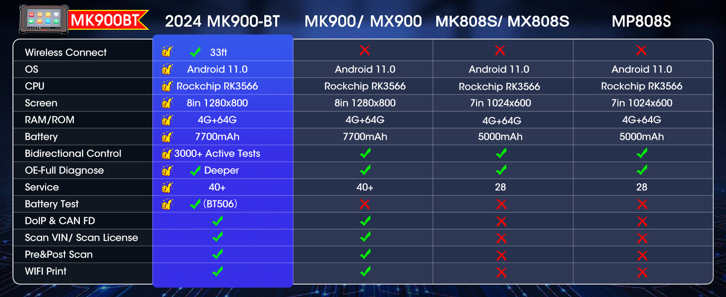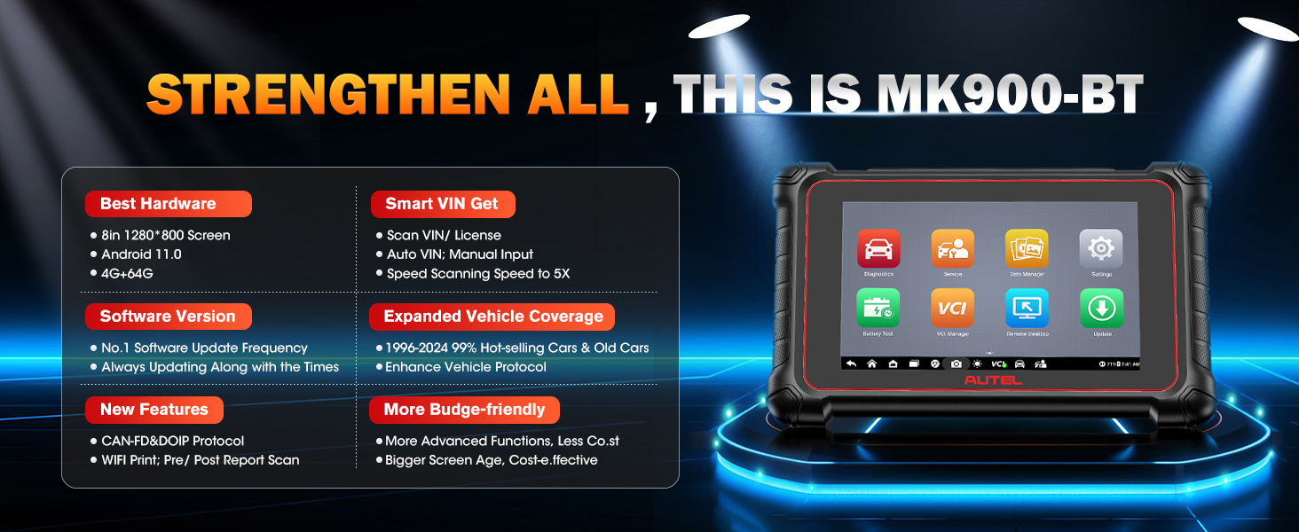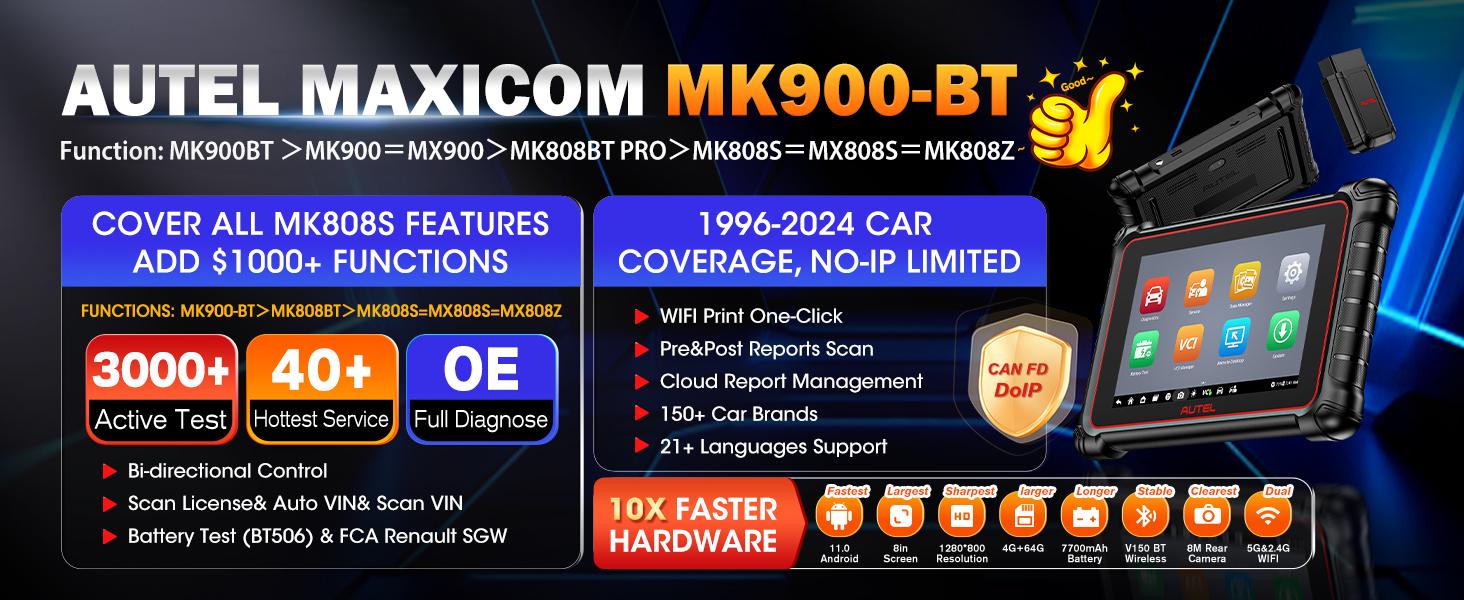 Autel MaxiCOM MK900BT on Android 11 -pohjainen diagnostiikkatabletti, joka korvaa MK808BT Pro -mallin ja tuo pidemmän akunkeston, enemmän muistia ja nopeamman suorituskyvyn. Se yhdistää CAN-FD- ja DoIP-protokollat, kaksisuuntaisen ohjauksen (3000+ aktiivista testiä), 40+ huolto-toimintoa, OE-tason kokojärjestelmädiagnostiikan, Wi‑Fi-tulostuksen sekä Auto Scan 2.0 -pikaskannauksen. Tuki FCA AutoAuth -kirjautumiselle ja VIN-/rekisterikilven skannaukselle 8MP-kameralla.