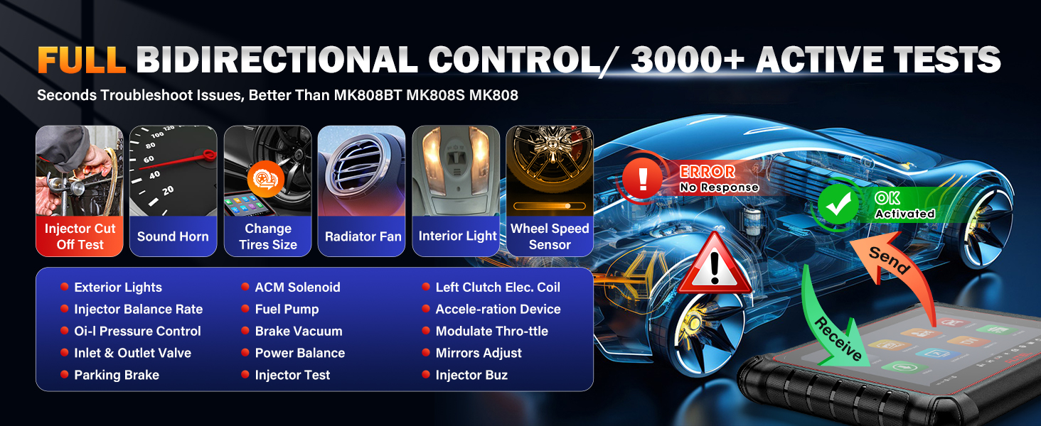 Lähetä komentoja suoraan toimilaitteille ja paikanna viat nopeasti. Esimerkkejä: jäähdyttimen puhallin, kaasuläpän säätö, ikkunoiden avaus/sulku, peilit, suutinsointi, valot ja äänimerkit, ovien lukot, suuttimet, ACC/LKAS pois päältä, ACM-solenoidit, polttoainepumppu, ilmastoinnin kierto, kytkimen päälle/pois, kytkinsolenoidi, kaasupolkimen testi, öljynpaineen ohjaus, kameran kohdistus, ajoneuvon horisontin kalibrointi, jarrujen alipaineen pumppaus, sisääntulo-/poistoventtiilien testit, jarrujen avaus, pyöränopeusantureiden syöttö, seisontajarrun testit (riippuen merkistä, mallista ja vuosimallista).