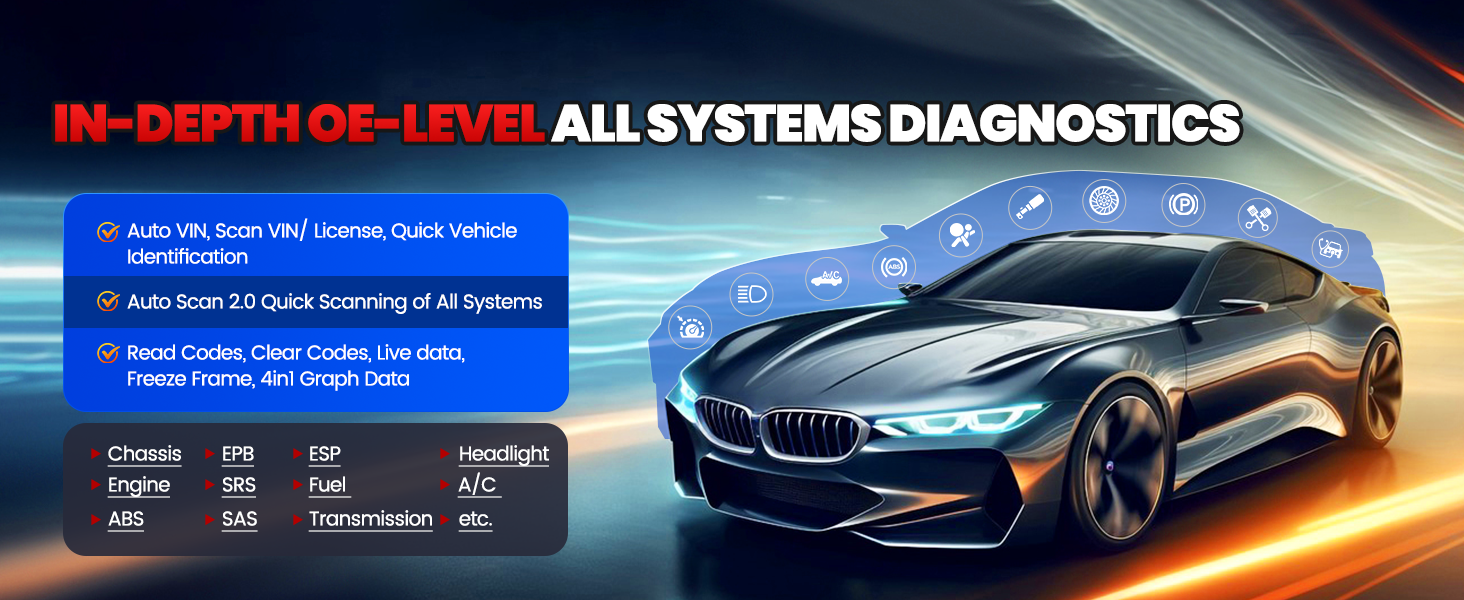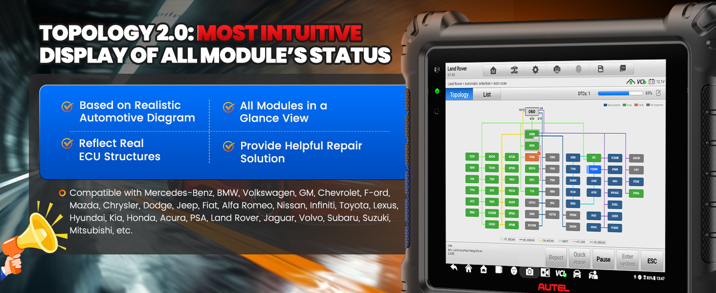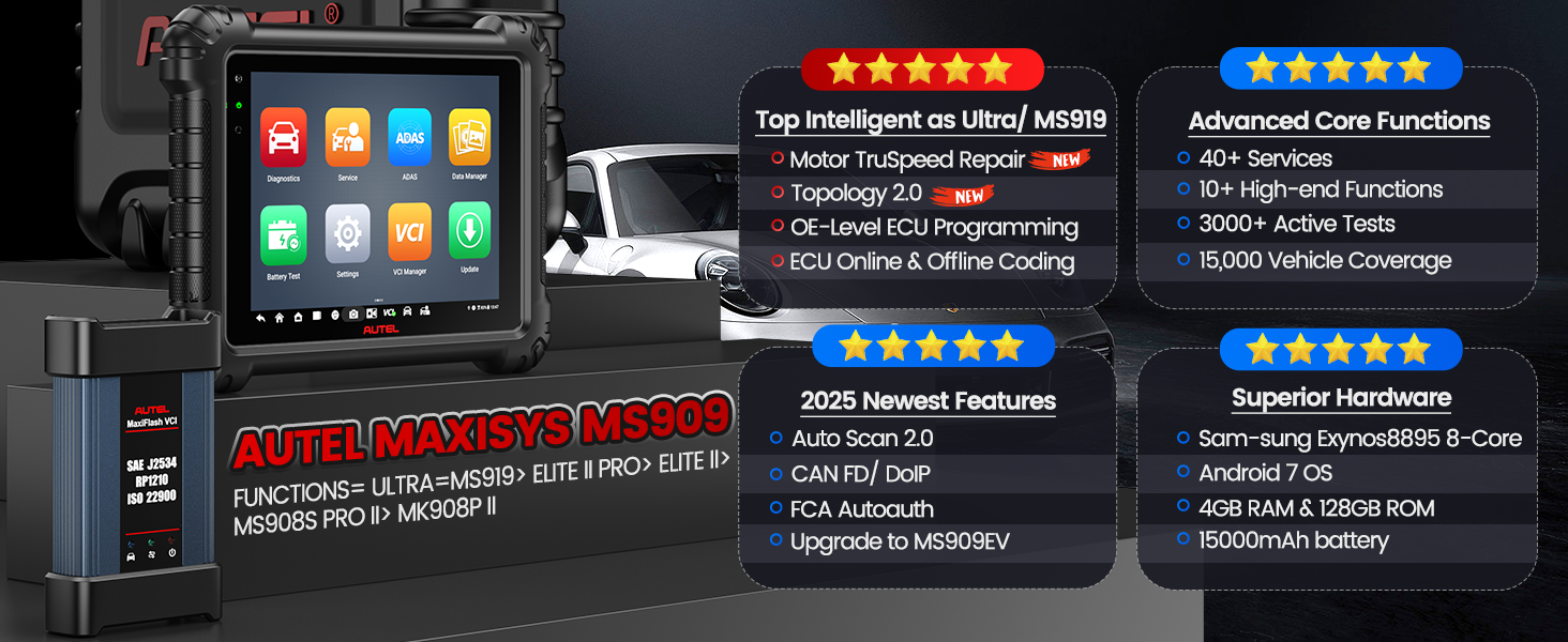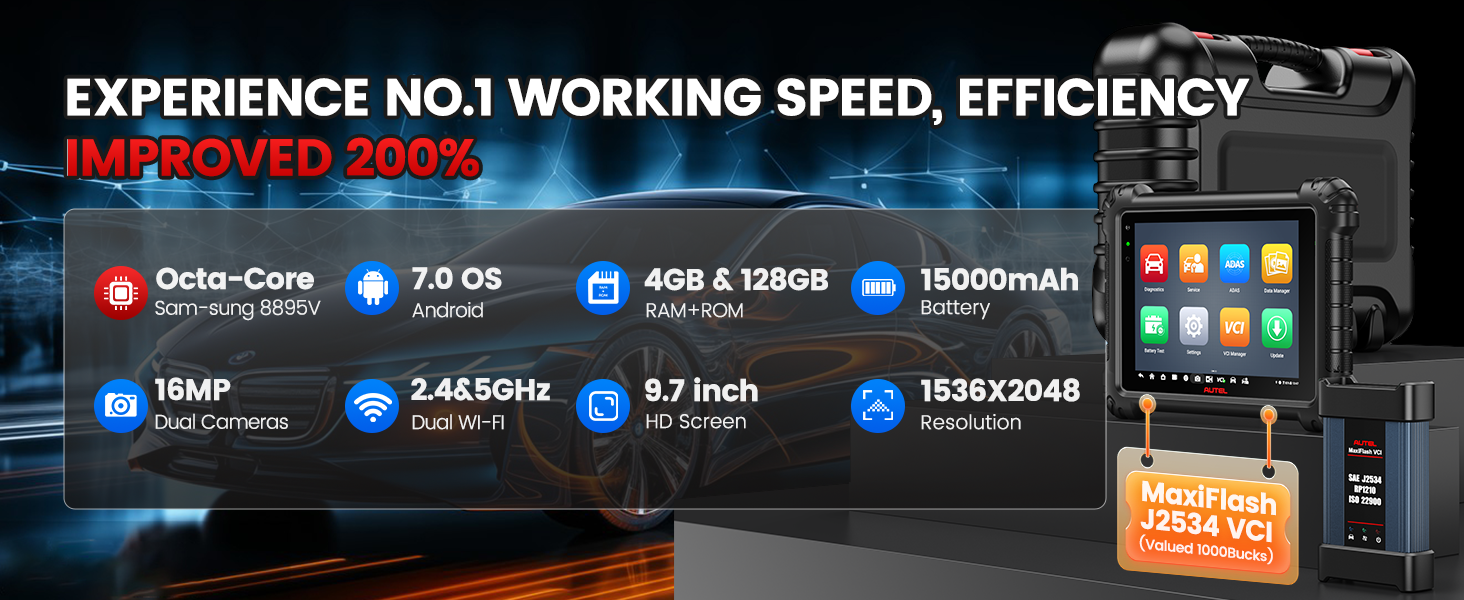 AUTEL MS909 on auton diagnostiikkalaite, jossa on Exynos 8895V -suoritin. Kahdeksanytiminen arkkitehtuuri varmistaa nopean ja tehokkaan käytön ajoneuvojen vianmäärityksessä.