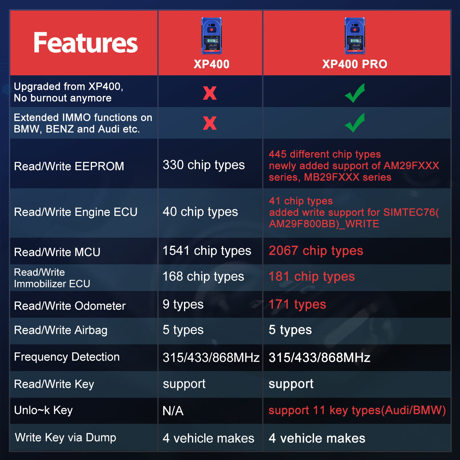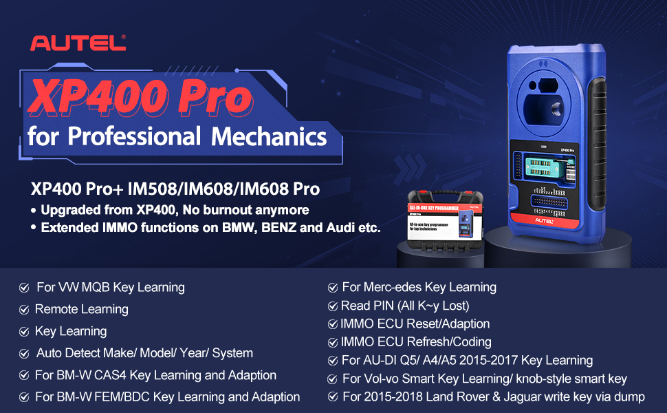 Autel XP400Pro korvaa XP400-mallin ja lisää toimintoja erityisesti BMW- ja Mercedes-järjestelmiin sekä EEPROM-lukuun. Uusien protokollien myötä käyttäjä voi lukea yli 2000 tyyppiä (siruja, komponentteja, laitteita), mukaan lukien EEPROM- ja MCU-luku, lisätyt matkamittarin luku-/kirjoitustoiminnot ja paljon muuta. Mukana myös lisätoiminnot EWS3-, W209-, NEC- ja muihin järjestelmiin.