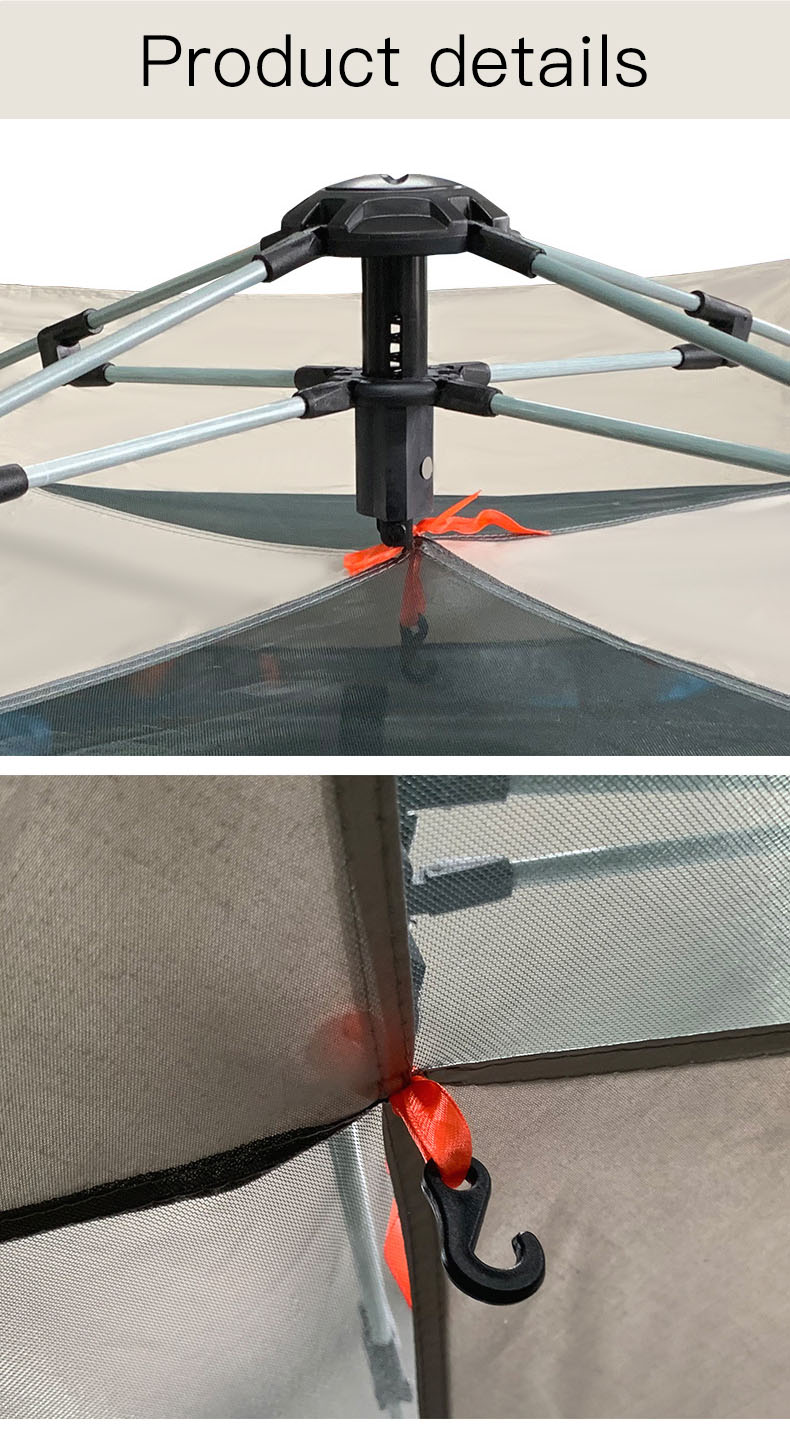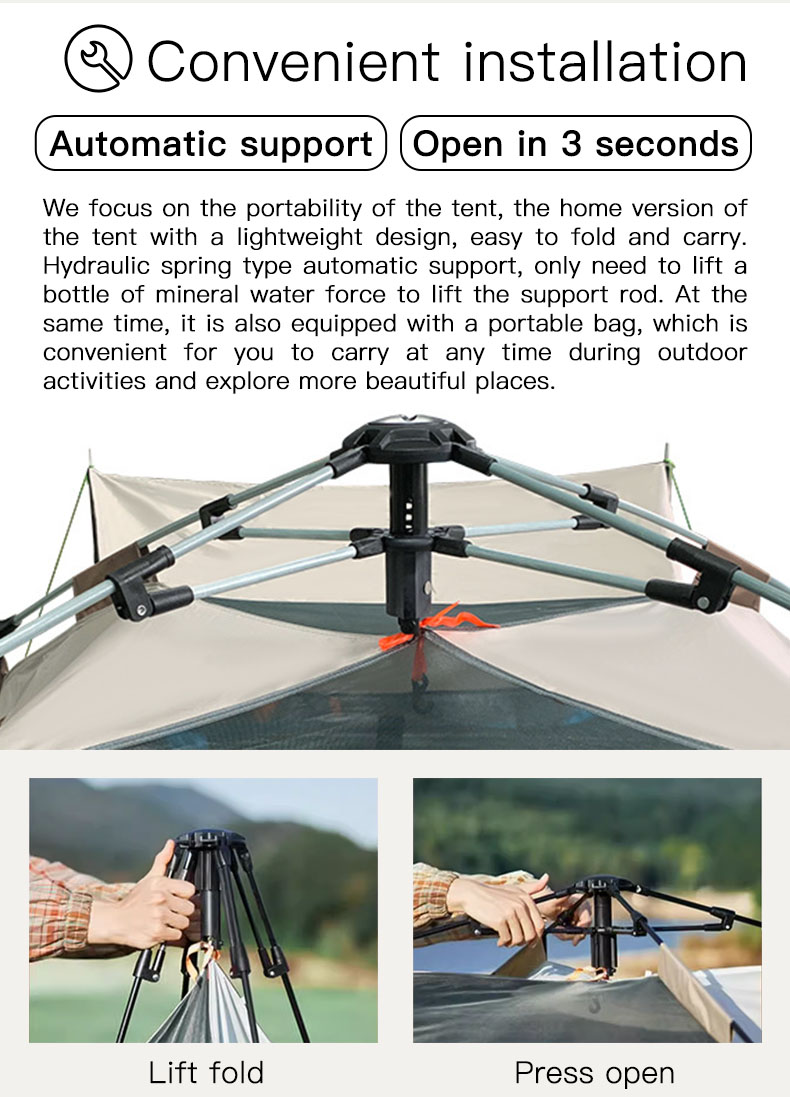 Kevyt, jousirakenteisella automaattisella tukikehikolla varustettu teltta on helppo pystyttää: tukitangon nostamiseen riittää kevyt liike. Mukana tuleva kantolaukku helpottaa kuljettamista ja säilytystä, joten teltta kulkee vaivatta mukana retkillä ja viikonloppureissuilla.