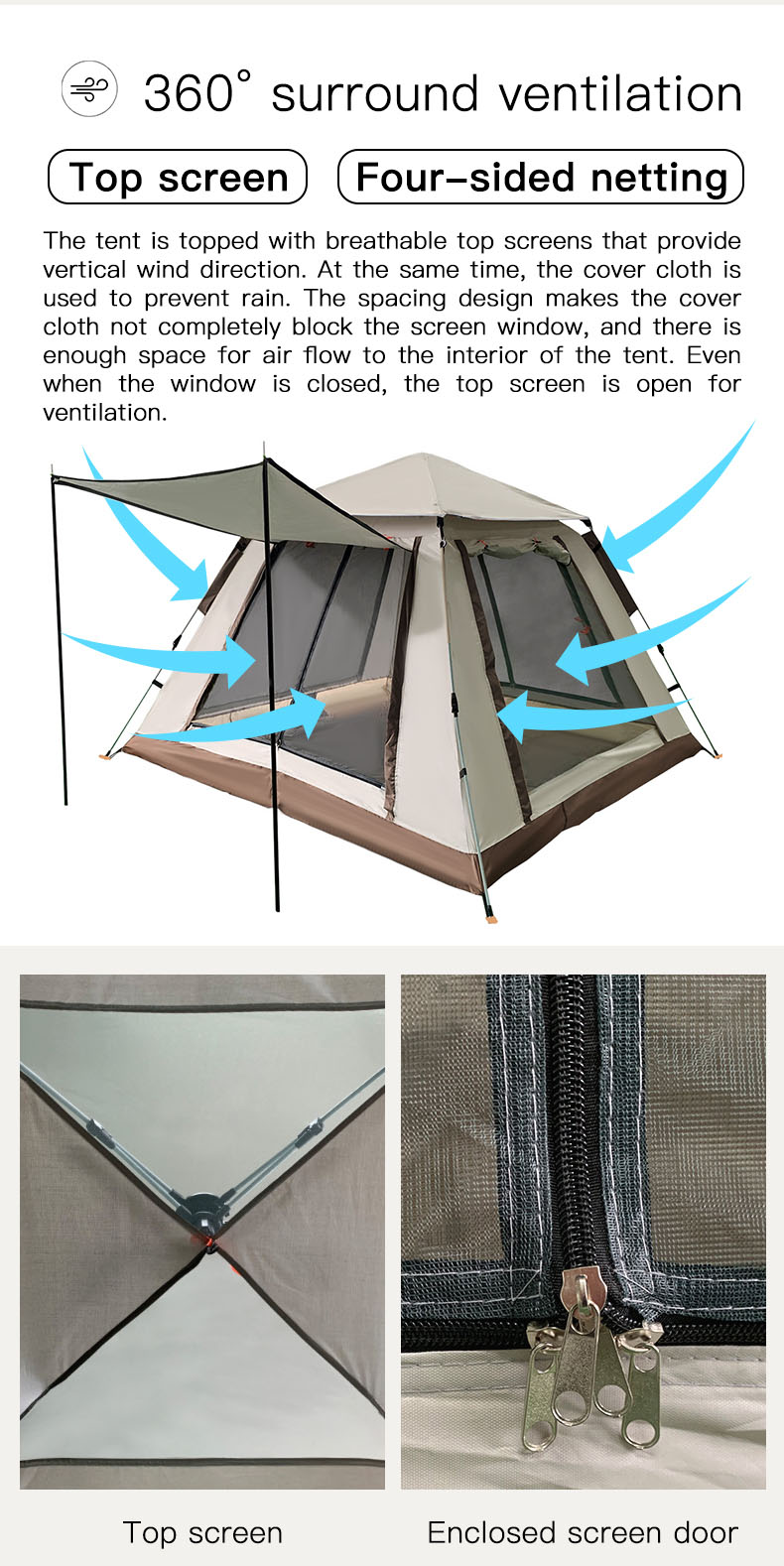 Teltan yläosassa on hengittävät verkkopaneelit, jotka päästävät ilman kiertämään pystysuunnassa. Suuret ikkunat ympäröivät telttaa ja tarjoavat sekä näkymät ympäristöön että suojan auringolta. Yläpuolinen suojakangas auttaa estämään suoran auringonpaisteen ja sateen, mutta on suunniteltu niin, ettei se peitä verkkoikkunoita, jolloin ilma pääsee kiertämään sisälle. Vaikka ikkunat suljetaan, yläosan verkkopaneeli pitää ilmanvaihdon käynnissä.