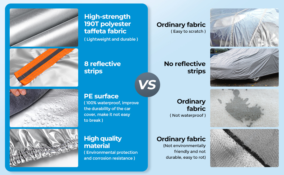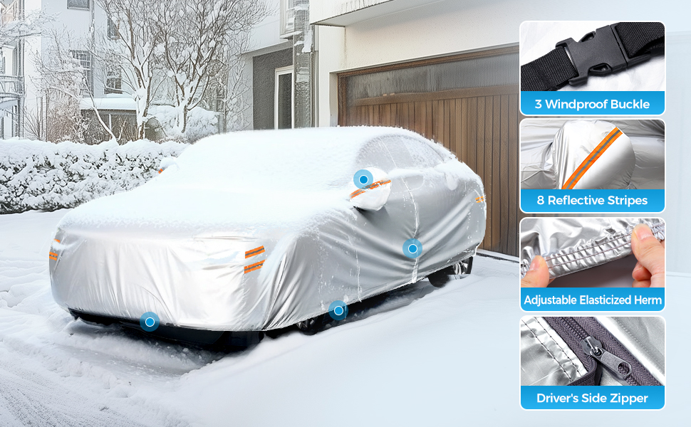 Autonsuoja 190T polyesteritaft, hopeanvärinen, sivuvetoketjulla, tuulenpitävä, 6 heijastinnauhaa