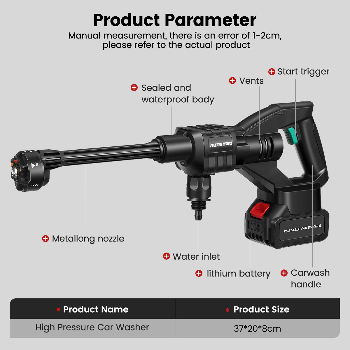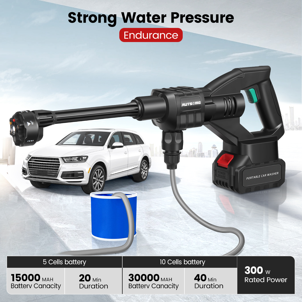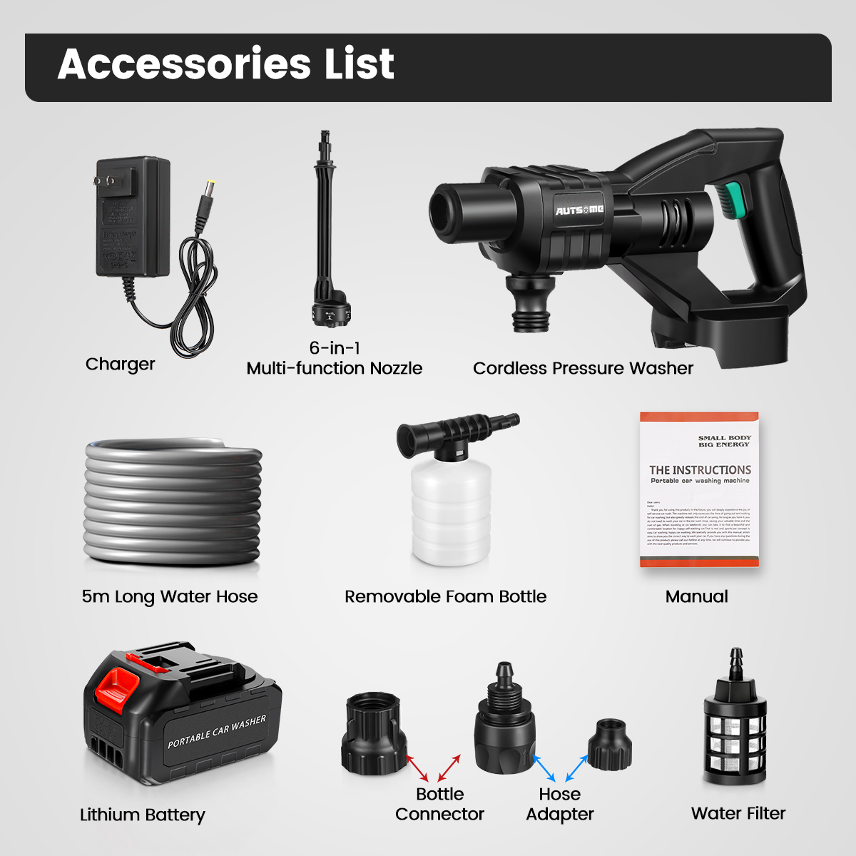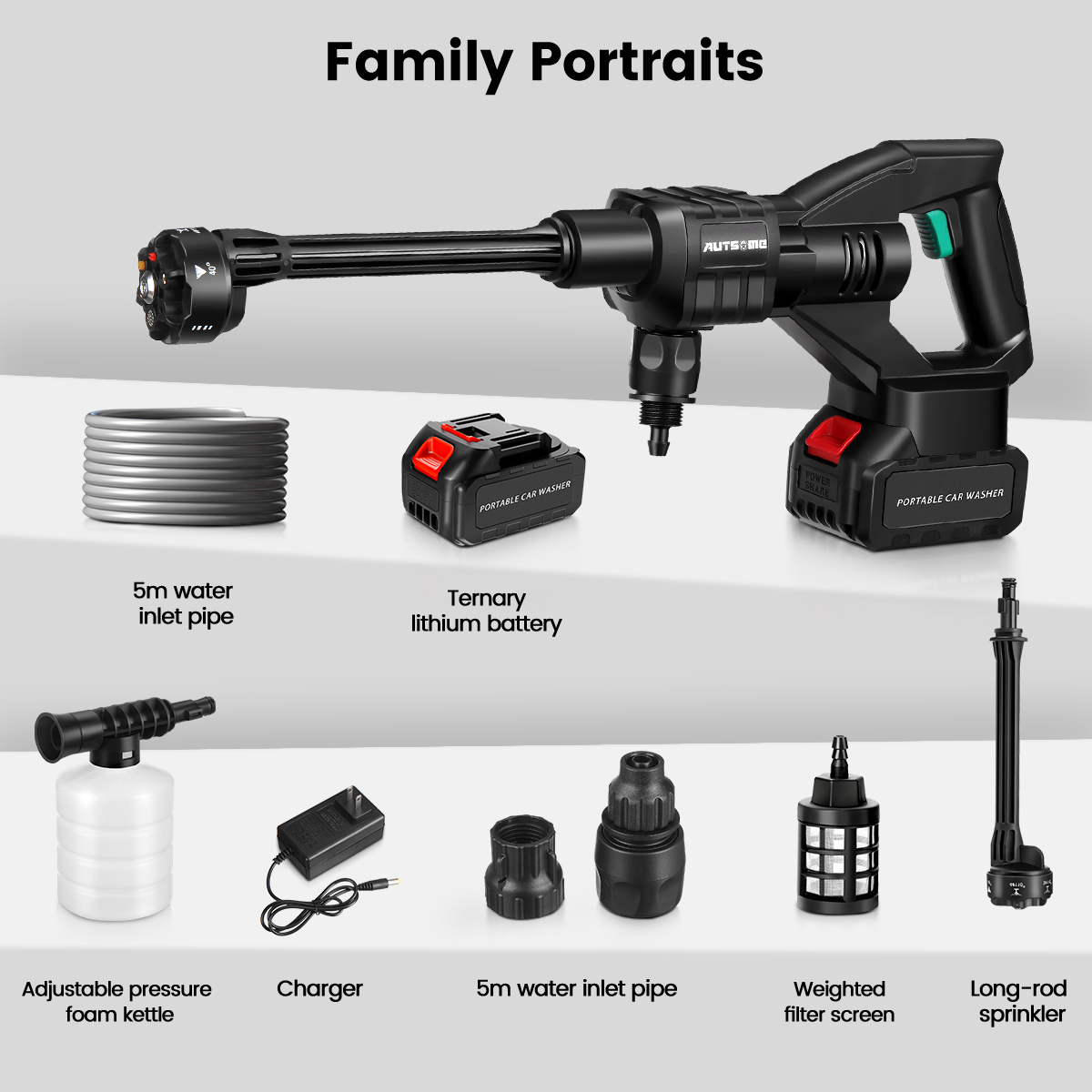 Autsome langaton kuusitoiminen korkeapainepesuri akulla viiden metrin letkulla ja vaahtopullolla