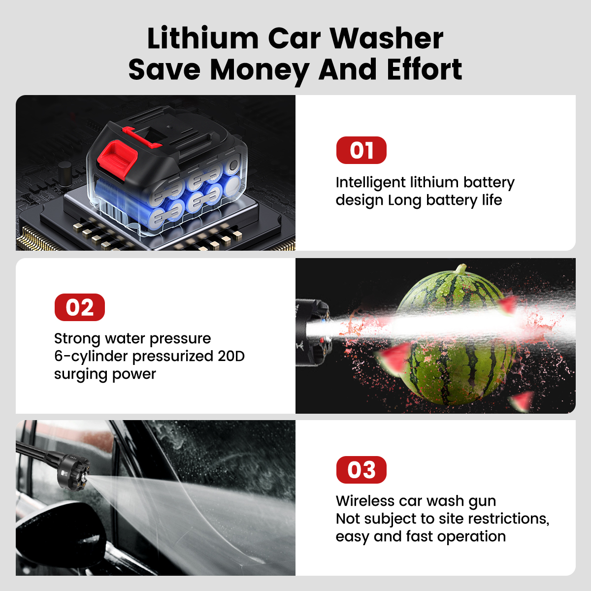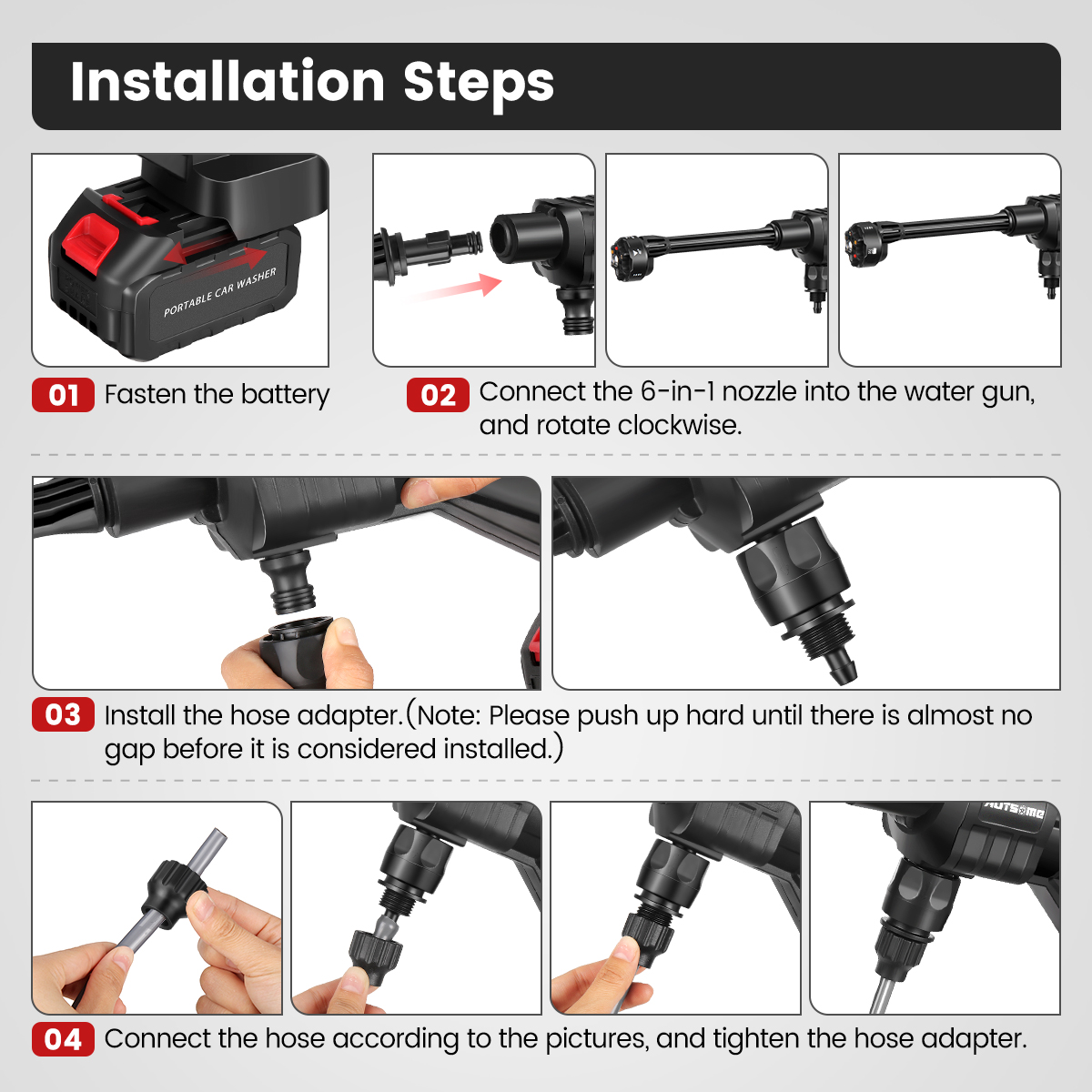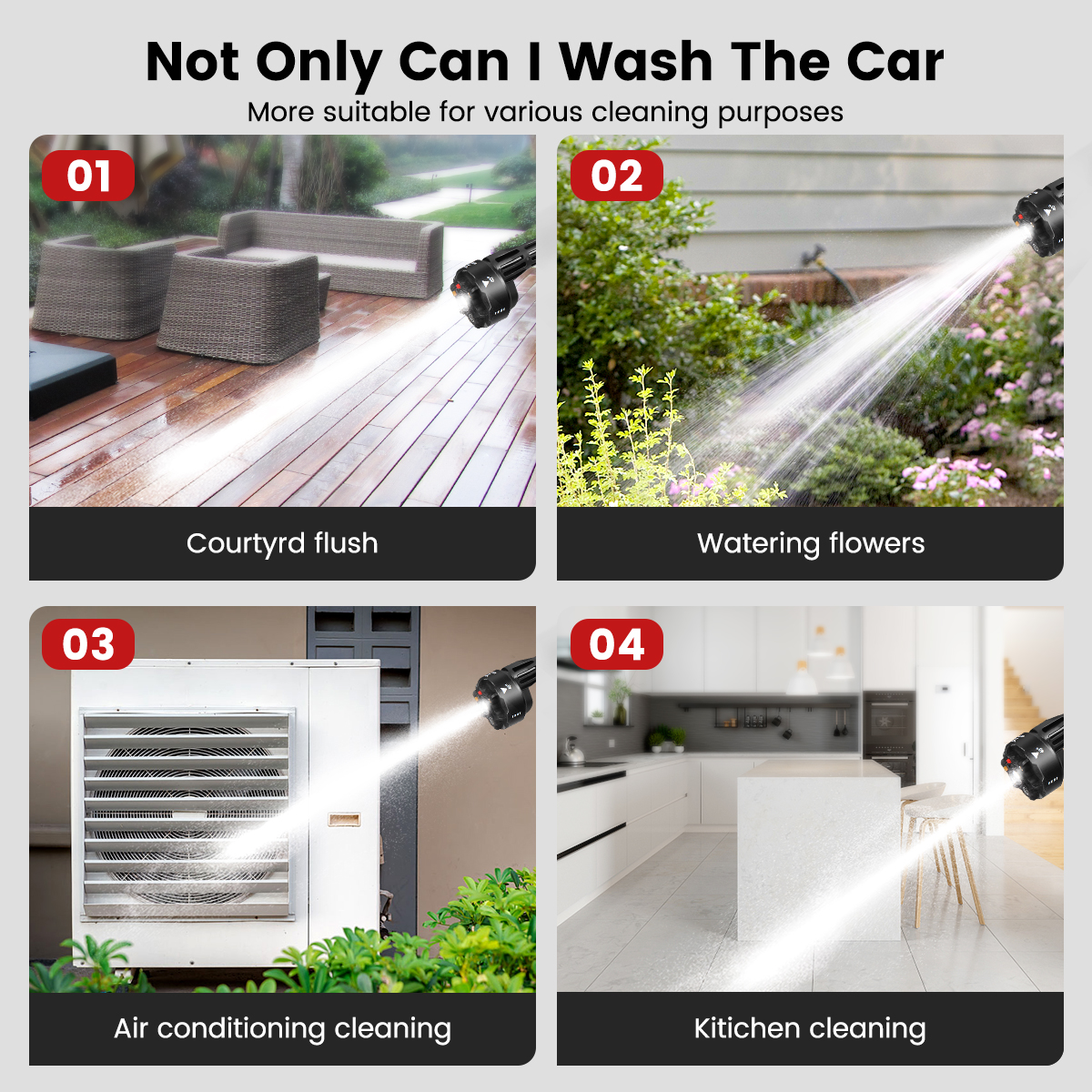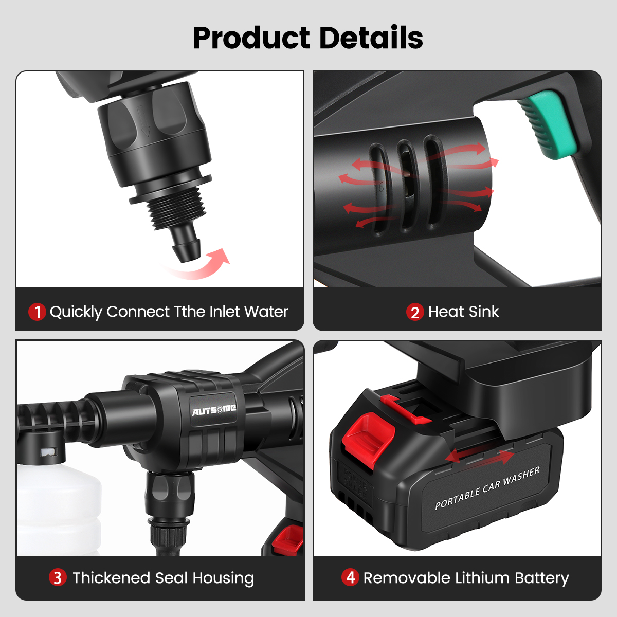 Autsome langaton kuusitoiminen korkeapainepesuri akulla viiden metrin letkulla ja vaahtopullolla
