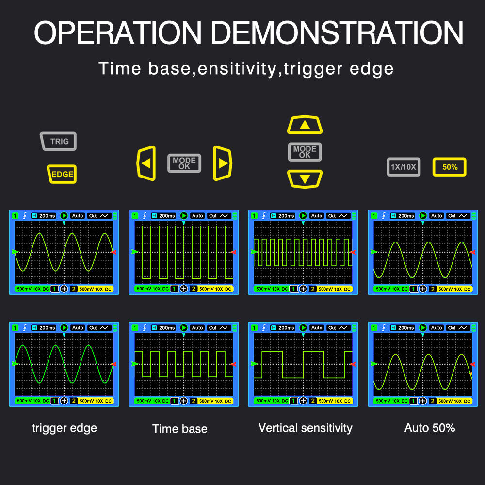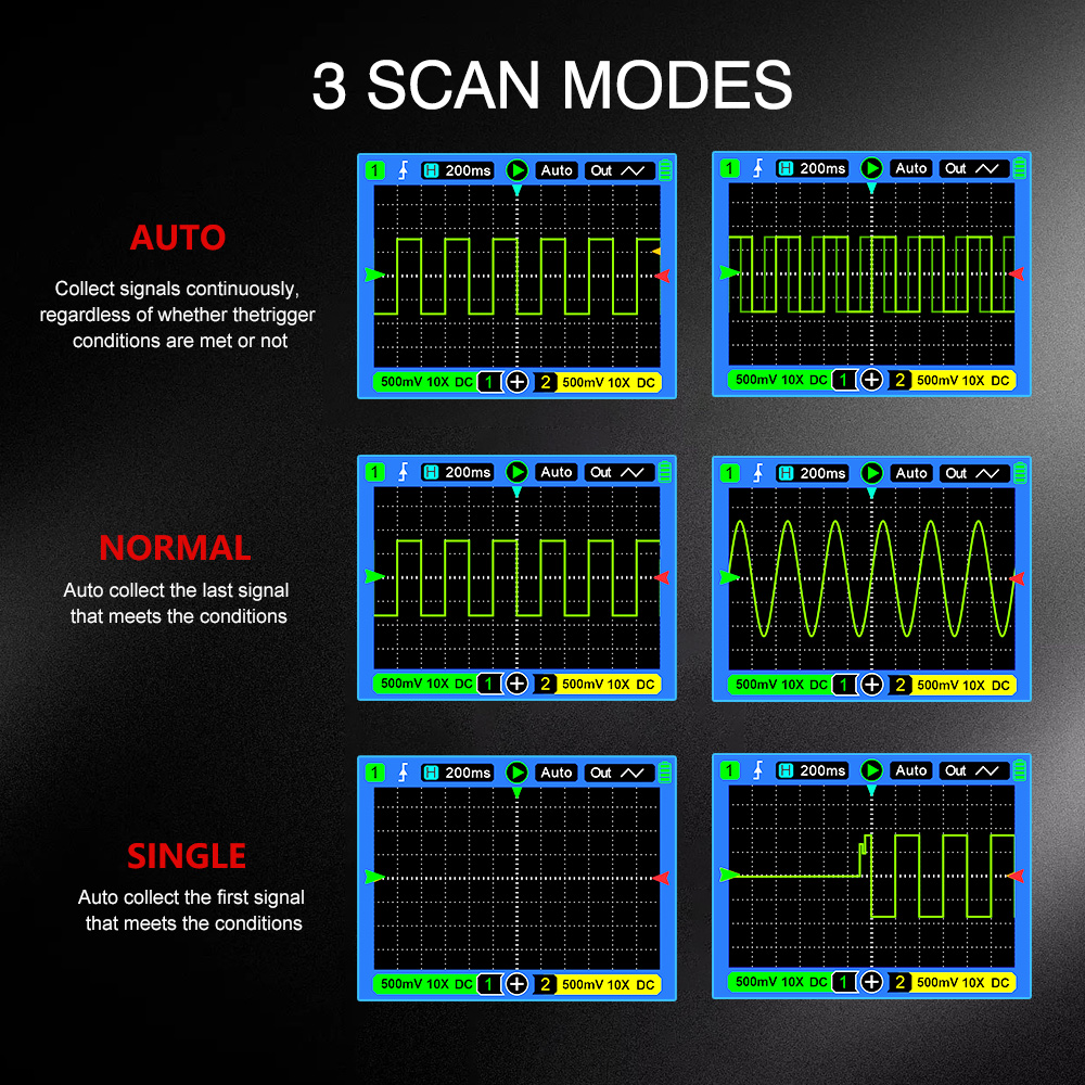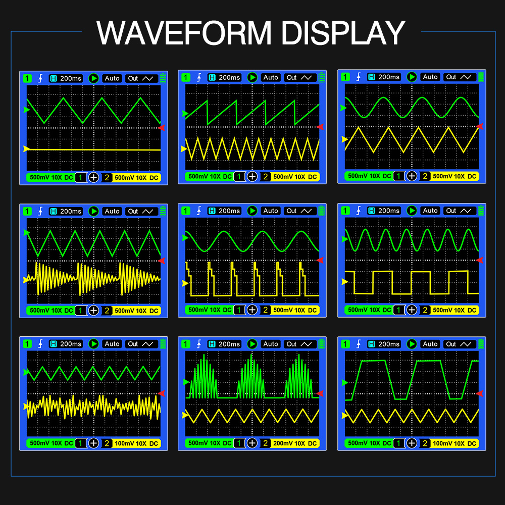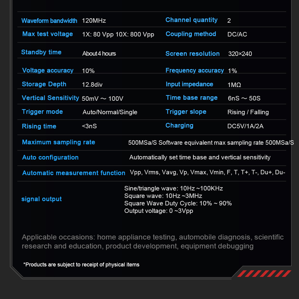 Kompakti kaksikanavainen käsioskilloskooppi, jossa on 320×240 TFT LCD -värinäyttö, jopa 120MHz kaistanleveys ja 500MSa/s näytteenottotaajuus. Soveltuu elektroniikan huoltoon, kenttämittauksiin, opetuskäyttöön ja harrasteprojekteihin, kun tarvitaan helposti mukana kulkevaa mittalaitetta.