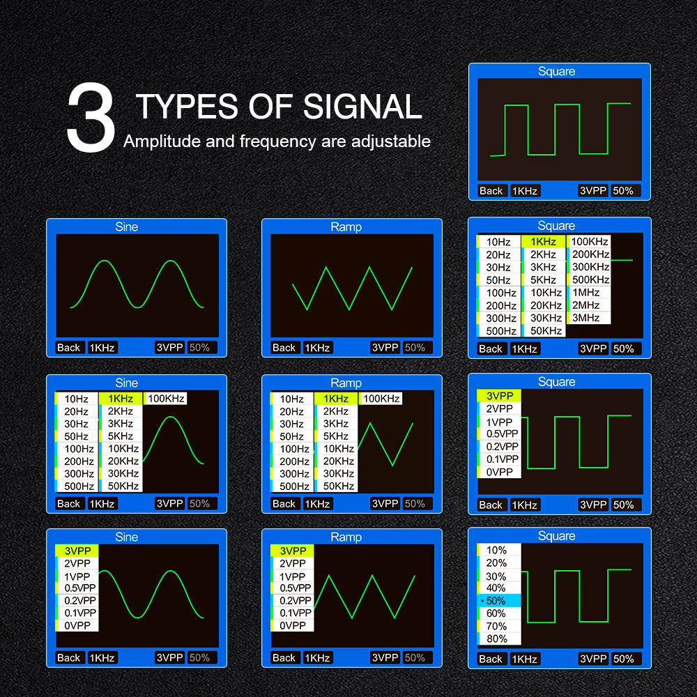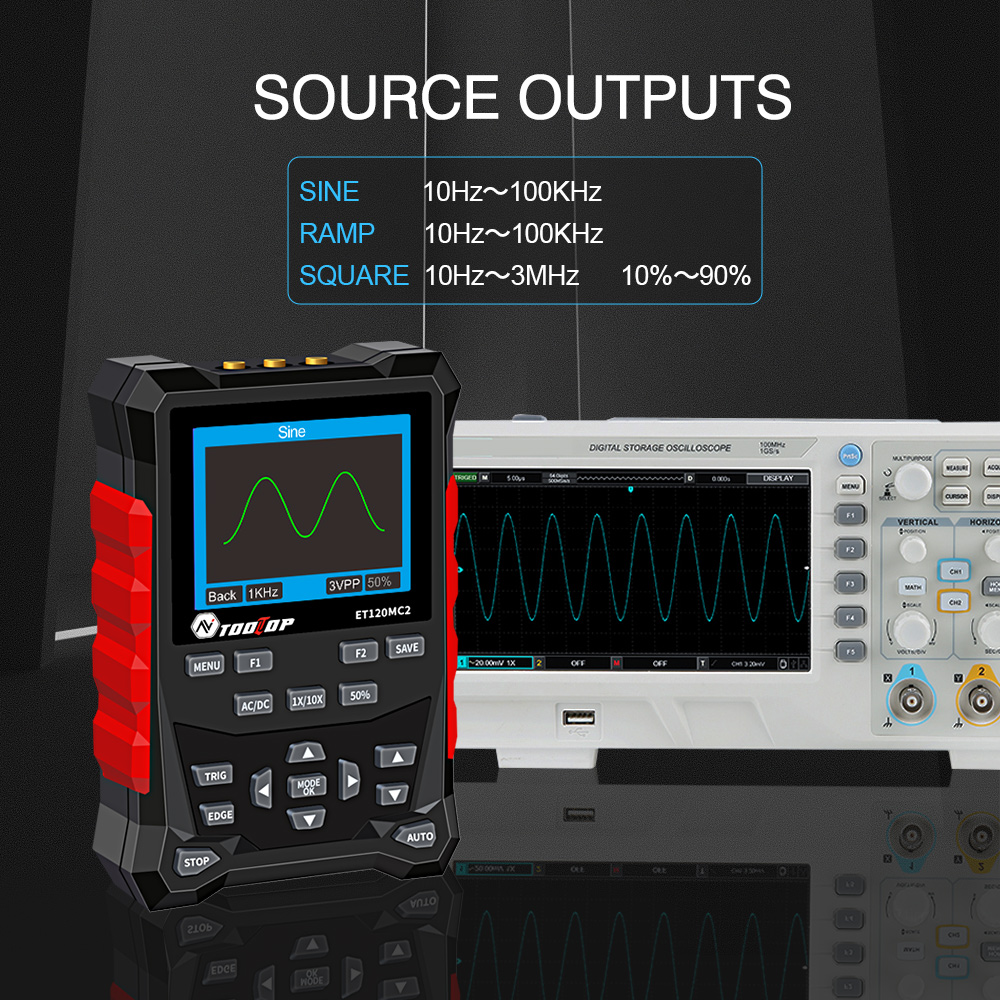 Sisäänrakennettu signaaligeneraattori tuottaa siniaaltoja ja kolmioaaltoja taajuusalueella 10Hz – 100KHz, mikä tukee erilaisia testaus- ja opetustilanteita.