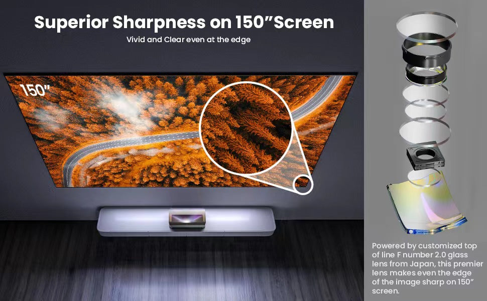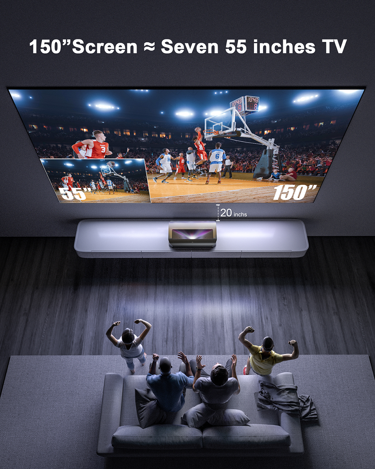 Suurin projektiokoko on 150 tuumaa ja Ultra Short Throw -etäisyys auttaa välttämään johtosotkut ja esteet näkymässä. Sijoitettuna vain 9.8' päähän seinästä saadaan 100" kuva (6' 80' näyttöön, 9.8' 100' näyttöön, 13.6' 120' näyttöön, 20' 150' näyttöön).