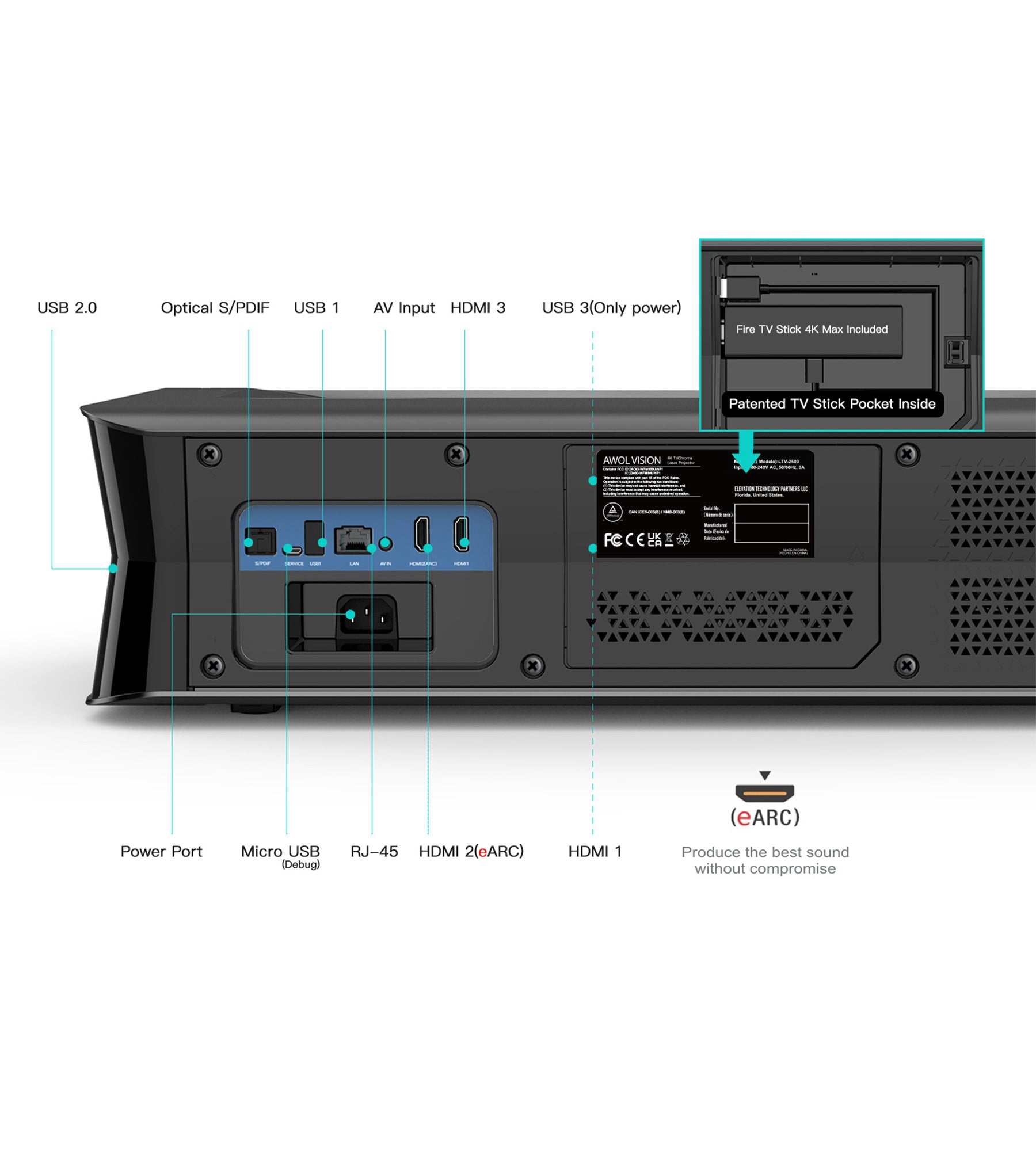 Patentoitu TV Stick -tasku sisältää HD- ja virtalähde-USB-portit, joten tikku voidaan piilottaa projektorin sisään ilman erillistä virtalähdettä. Mukana toimitetaan Amazon Fire TV Stick 4K Max. Saat sovellukset käyttöön heti projektorin käynnistyessä.