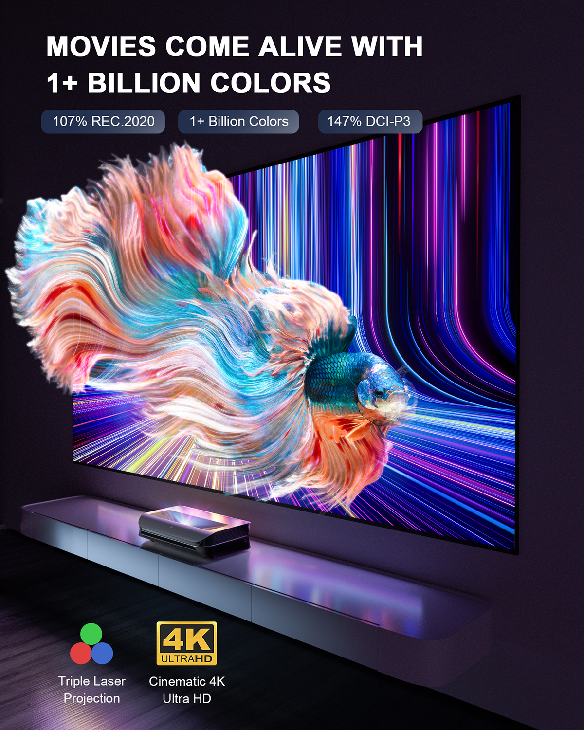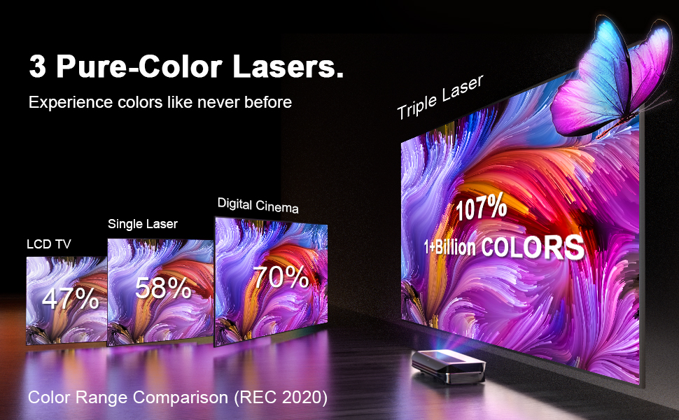 - Puhdas RGB-kolmoislaser tarjoaa laajan väriavaruuden (107% BT.2020) ja luonnolliset värit.