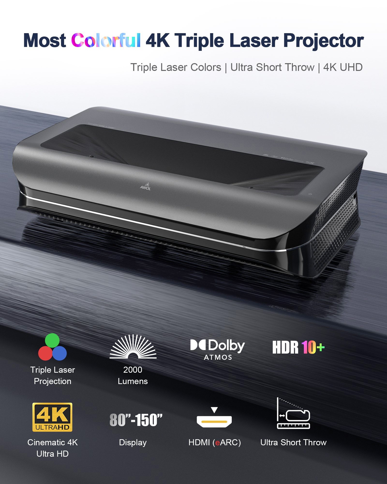 - AWOL VISION LTV-2500 ja LTV-3500 käyttävät puhdasta Triple Laser -tekniikkaa ilman väripyörää, mikä parantaa värikylläisyyttä ja vähentää melua ja “rainbow”-efektiä verrattuna väripyörällisiin lasereihin. HDR10+ ja 4K UHD nostavat väritoiston tasoa: kuva on elävä ja terävä ilman yksityiskohtien katoamista.