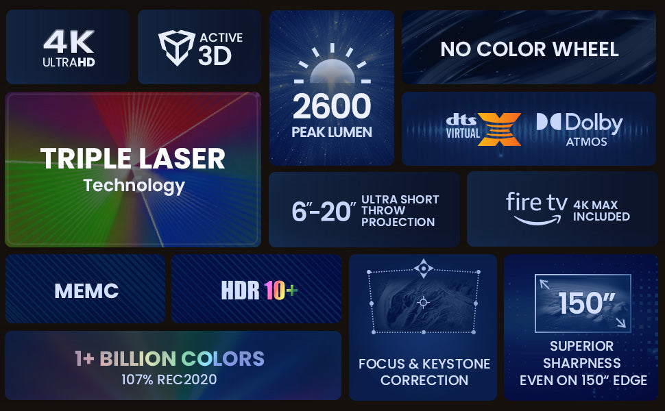 - Triple Laser (puhdas laser/Tri-Chorma -laser) -tekniikka projisoi natiivin punaisen, vihreän ja sinisen lasersäteen, kattaa 107% Rec. BT.2020 -väriavaruudesta ja 1 miljardin värin sekä saavuttaa erinomaisen väriyhtenäisyyden.