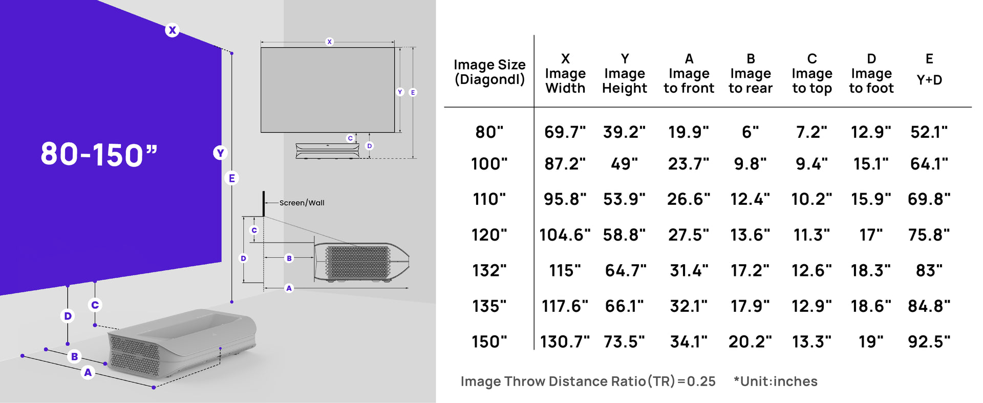Maksimikuva 150 tuumaa ultralyhyellä heittoetäisyydellä. Sijoitettuna vain 9.8 tuumaa seinästä projektori tuottaa 100 tuuman kuvan (6' 80' näytölle, 9.8' 100' näytölle, 13.6' 120' näytölle, 20' 150' näytölle). Vähemmän johtosotkua ja esteettömämpi näkymä.