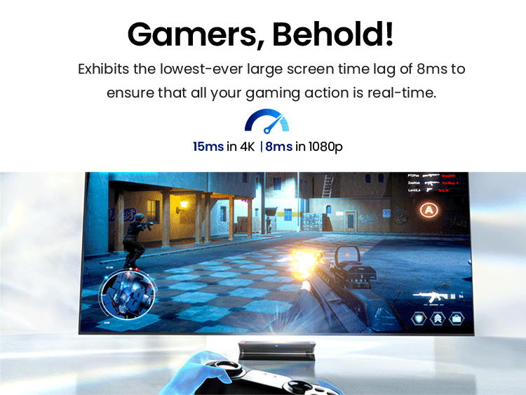 Päälle Pelitila ja viive jopa 30ms 4K:lla ja 17ms 1080P:llä – toiminta välittyy reaaliaikaisena. Silmäystävällinen ja sopii pitkille pelisessioille.