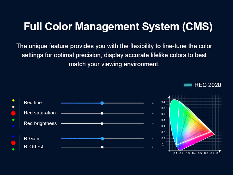 - Täydellinen värihallinta (CMS), HDR10+ ja 4K UHD