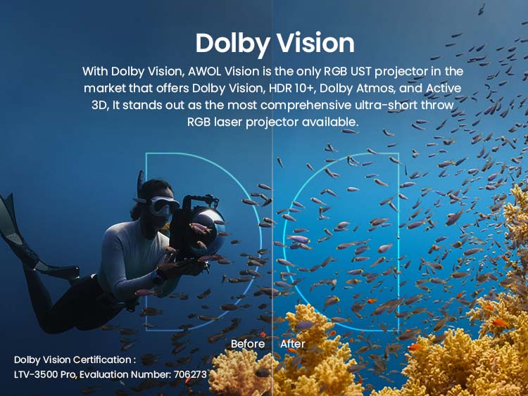 AWOL VISION LTV-2500 ja LTV-3500 käyttävät puhdasta kolmivärilaseria ilman väripyörää, mikä parantaa värejä ja vähentää melua sekä sateenkaari-ilmiötä verrattuna väripyörällisiin ratkaisuihin. Yhdessä HDR10+ ja 4K UHD -tuennan kanssa väritoisto on tarkka ja yksityiskohdat säilyvät.
