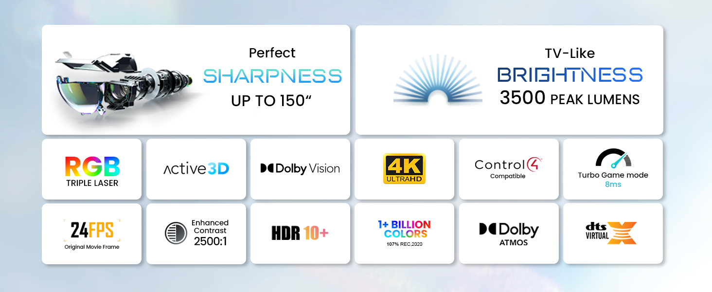 Kolmivärilasereilla kirkkaat luonnolliset värit erittäin lyhyt heittomatka jättinäytölle sisäänrakennettu Fire TV matala viive pelaukseen helppo tarkennus 3D-tuki ja automaattinen kirkkaussäätö