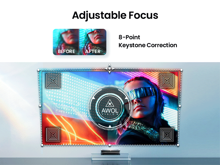 Säädettävä tarkennus ja 8 pisteen keystone-korjaus