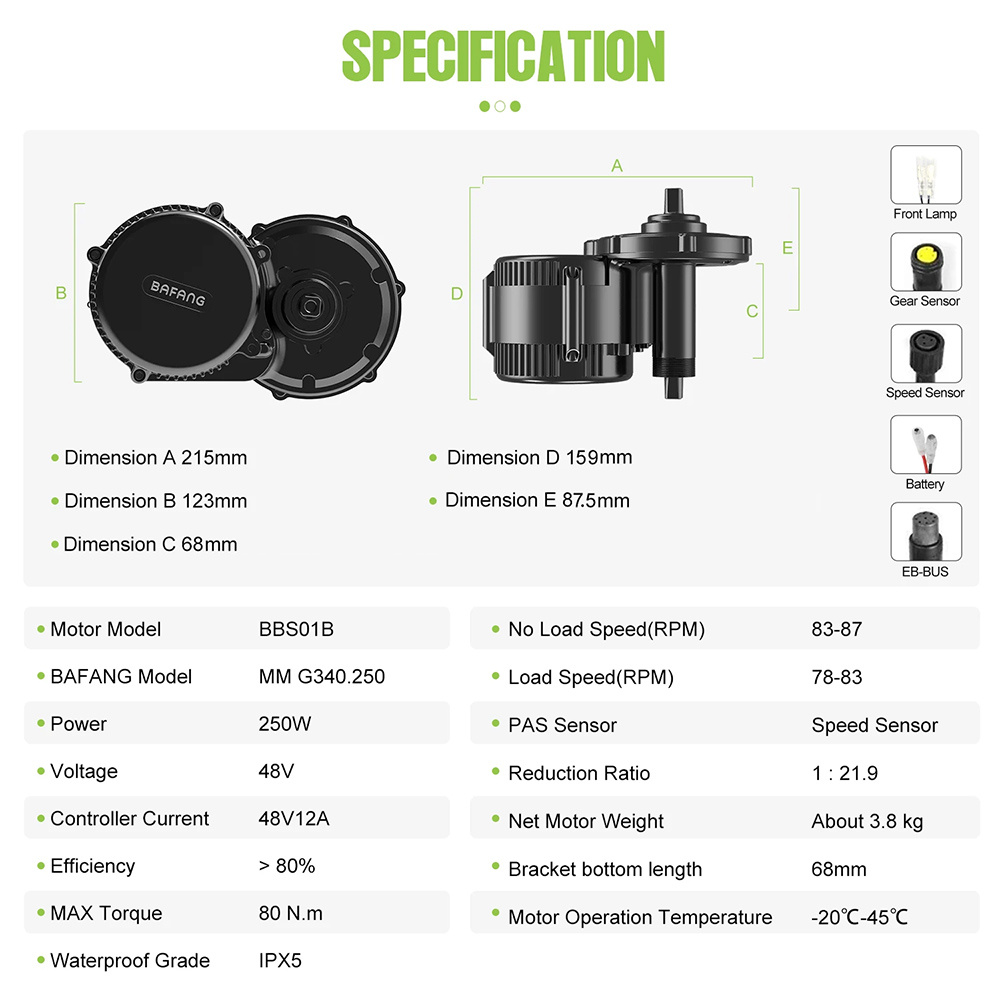 BAFANG BBS01B -keskimoottorisarja tarjoaa luotettavan 250W harjattoman sähköavun tavallisiin polkupyöriin. Pakettiin sisältyy moottori, värinäyttö, eturatas ja asennussarja, joten voit rakentaa oman sähköpyöräsi siistillä rungon sisäisellä ratkaisulla. Integroitu ohjain, selkeä TFT-näyttö ja useita PAS-tasoja tukevat mukavaa ja hallittua ajoa arjessa ja vapaa-ajalla.