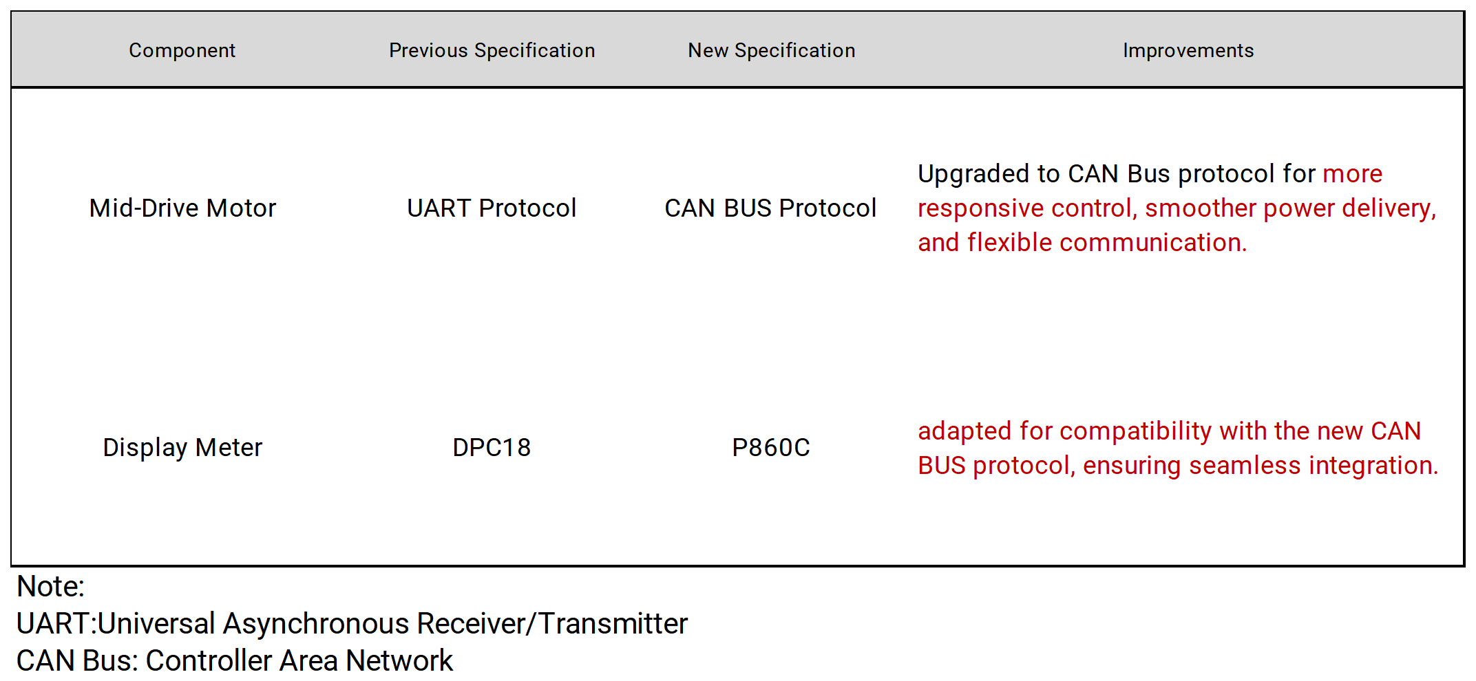 Parhaan suorituskyvyn ja osien saatavuuden varmistamiseksi tähän tuotteeseen on tehty päivityksiä. Yleiskuva muutoksista on esitetty alla olevassa kuvassa.