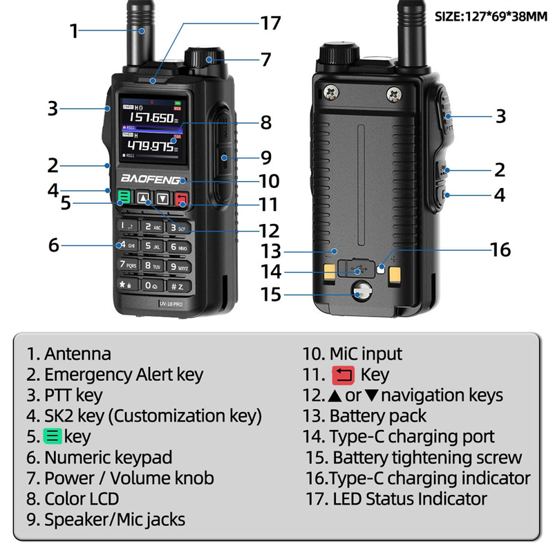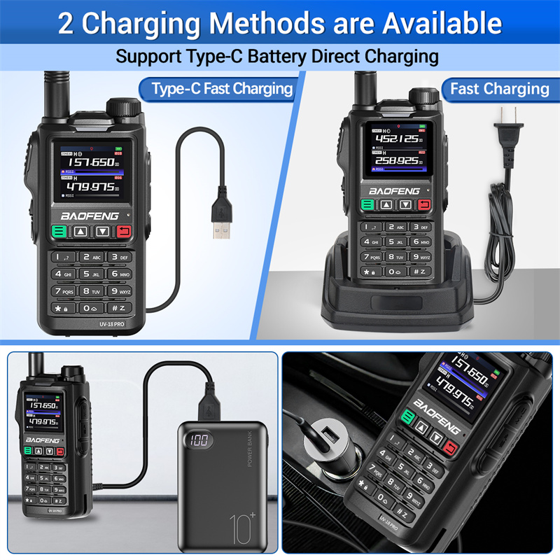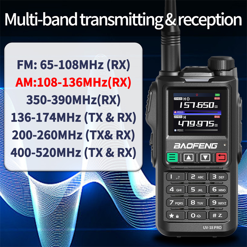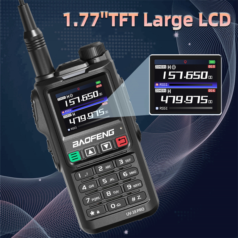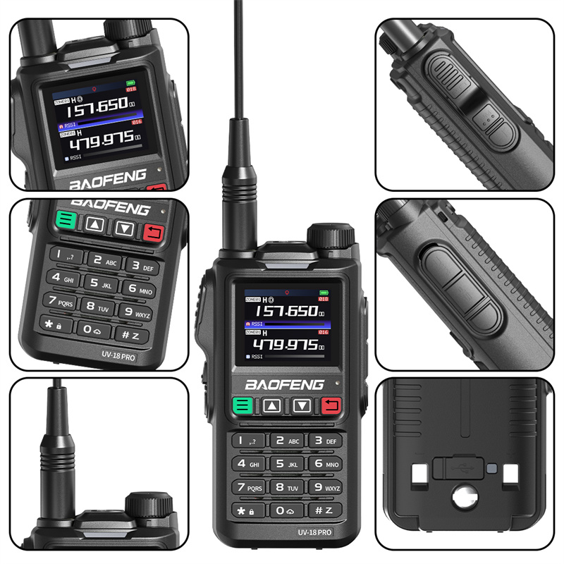 Kompakti ja kestävä Baofeng UV-18 PRO on monikaistainen radiopuhelin pitkälle kantamalle. Se tarjoaa korkean lähetystehon, selkeän kuuluvuuden sekä GPS-tuen ja langattoman taajuuksien kopioinnin helppoon käyttöönottoon ja ryhmäviestintään.
