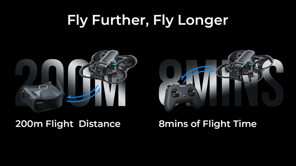 Jopa 8 mins lentoaika mahdollistaa pitkät harjoitussessiot ja enintään 200m lentomatkan sisällä tai ulkona. Voit keskittyä lentotaitojen hiomiseen ilman jatkuvia akunvaihtoja. Paketin tehokas, viiveeltään pieni 350mW-videolähetin takaa reaaliaikaisen kuvan välityksen vakaalla signaalilla jopa 200 metrin etäisyydelle. Viive pysyy pienenä, jolloin FPV-lento tuntuu välittömältä ja hallittavalta.