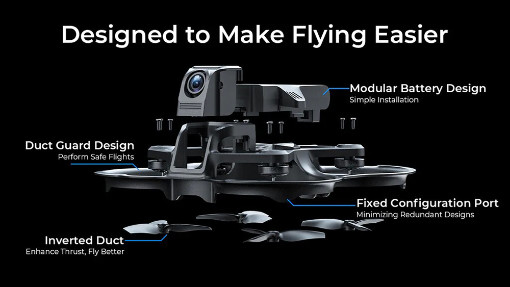 Jokainen yksityiskohta on mietitty helpottamaan aloittelijan ensimmäisiä lentoja. Käänteinen kanava-/suojarakenne lisää työntövoimaa ja vakautta, mikä tukee tarkkaa lentokäytöstä. Kiinteä liitäntäpaikka ja modulaarinen akkurakenne vähentävät turhia rakenteita ja tekevät asennuksesta yksinkertaista. Kanavasuojat suojaavat potkureita ja auttavat selviämään mahdollisista osumista.