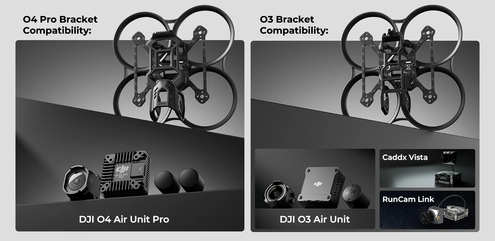 - Modulaarinen HD VTX -kiinnitysjärjestelmä mahdollistaa DJI O3 Air Unit- ja O4 Air Unit Pro -kiinnikkeiden nopean vaihdon ilman rungon muutoksia.