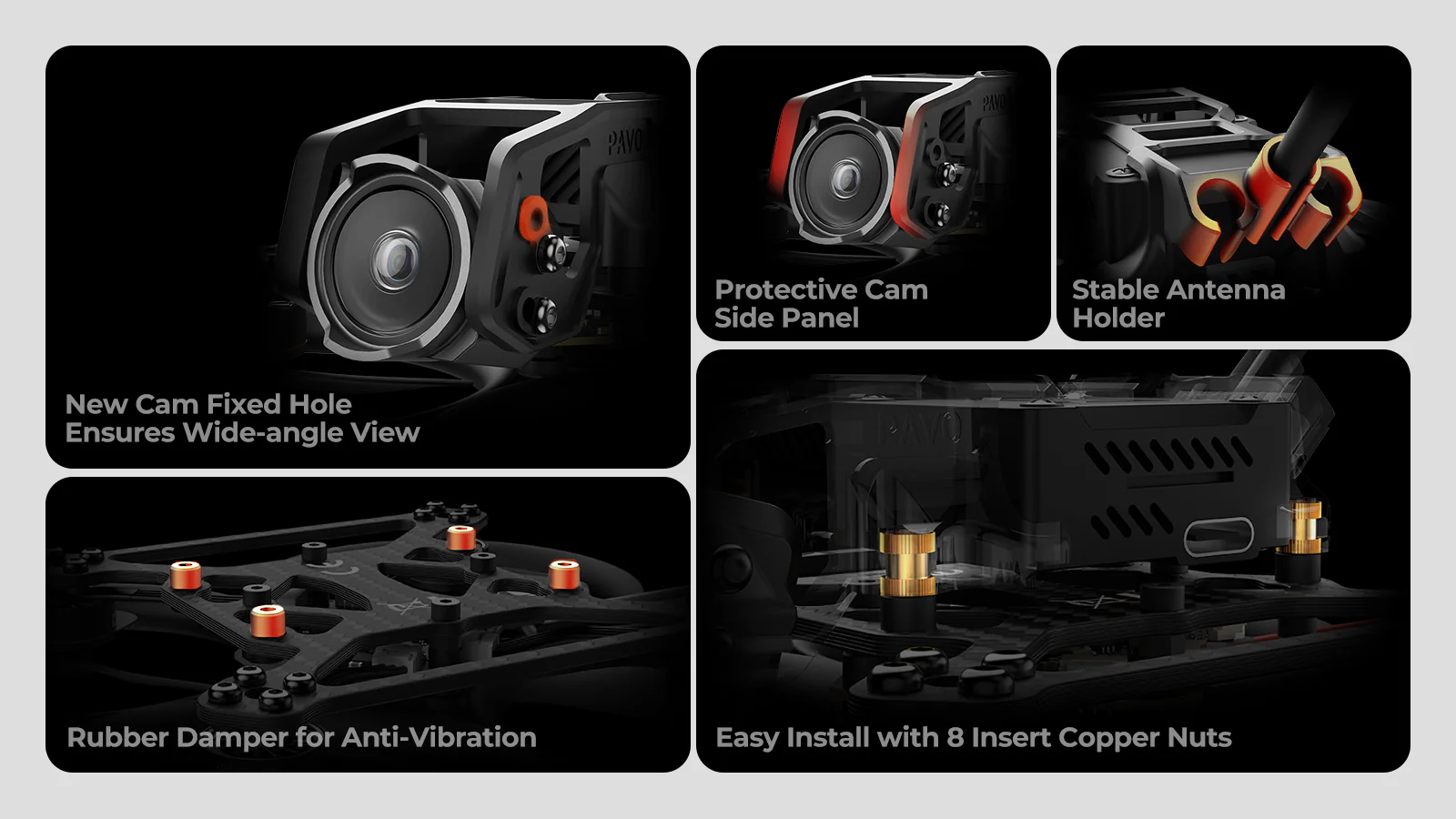 - Vakaa elokuvamainen kuva: ruiskuvalettu HD VTX -kiinnike ja Pavo-sarjan kumivaimennus vähentävät tärinää, kaksoiskiinnitysreiät tukevat O4 Pro -laajakulmakameraa, ja optimoitu antennipaikka edistää tasalaatuista kuvaa.