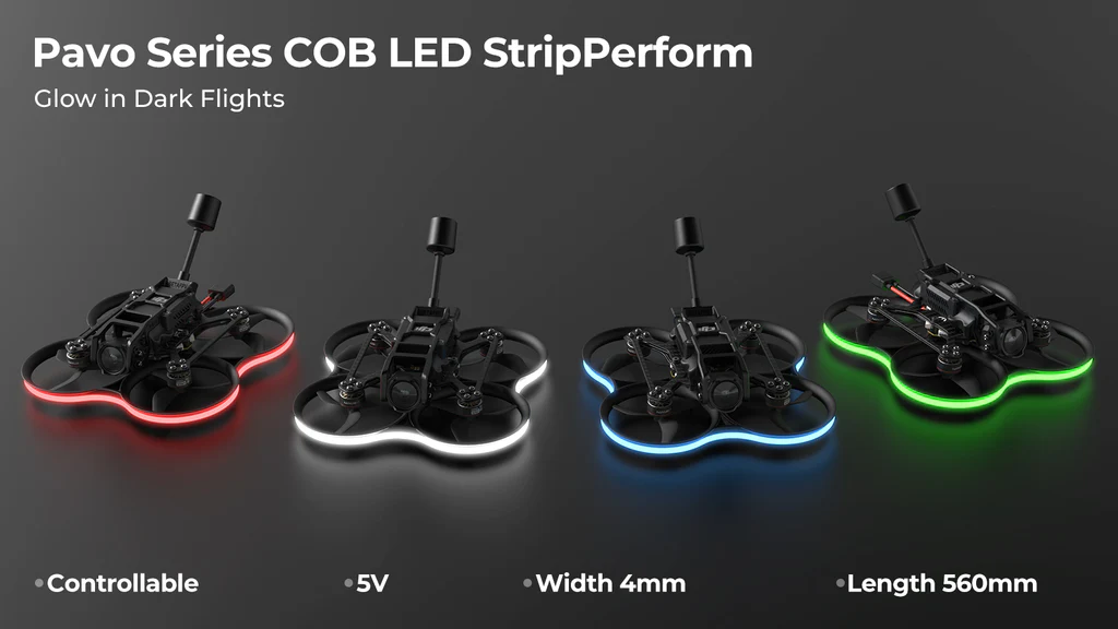 Pavo-sarjan COB LED Strip on 5V-jännitteellä toimiva LED-nauha, jonka mitat ovat 560 mm * 4 mm. Se parantaa näkyvyyttä ja helpottaa pilotin mahdollisuuksia seurata dronen lentoa hämärässä tai yöllä, mikä lisää turvallisuutta. Nauha voidaan kiinnittää tukevasti rungon suojaduktiin, ja se tuo näyttäviä valotehosteita sekä erottuvan ulkonäön. Vaihtoehtoina on yksivärinen jääsininen, valkoinen, vihreä tai punainen, tai voit yhdistellä useita värejä oman lentokokemuksen personoimiseksi.