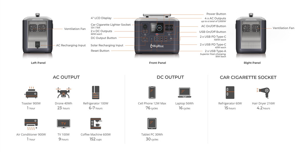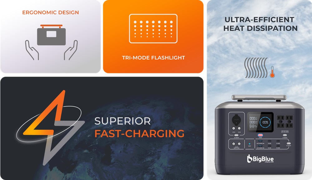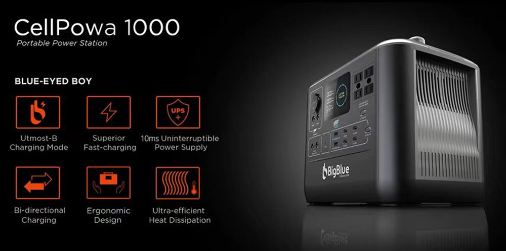 BigBlue CellPowa 1000 -kannettava virtalähde tukee samanaikaista latausta ja purkua ja tarjoaa varavirtasyötön tärkeille laitteille noin 10 ms viiveellä, jos sähköverkosta tuleva virta katkeaa. Suuri 4.3-tuumainen LCD-näyttö esittää reaaliaikaisesti virran, jännitteen, jäljellä olevan latausajan, lämpötilan ja varoitukset. Käyttö on hiljaista ja pakokaasujen olematonta, joten laite soveltuu hyvin sekä sisä- että ulkokäyttöön.