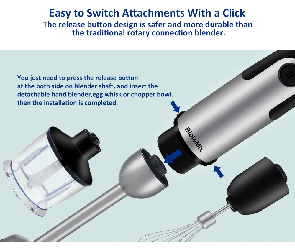 - Vankka ja turvallinen rakenne – Ruostumattomat terästerät ja BPA-vapaat muoviosat kestävään ja turvalliseen ruoan valmistukseen.