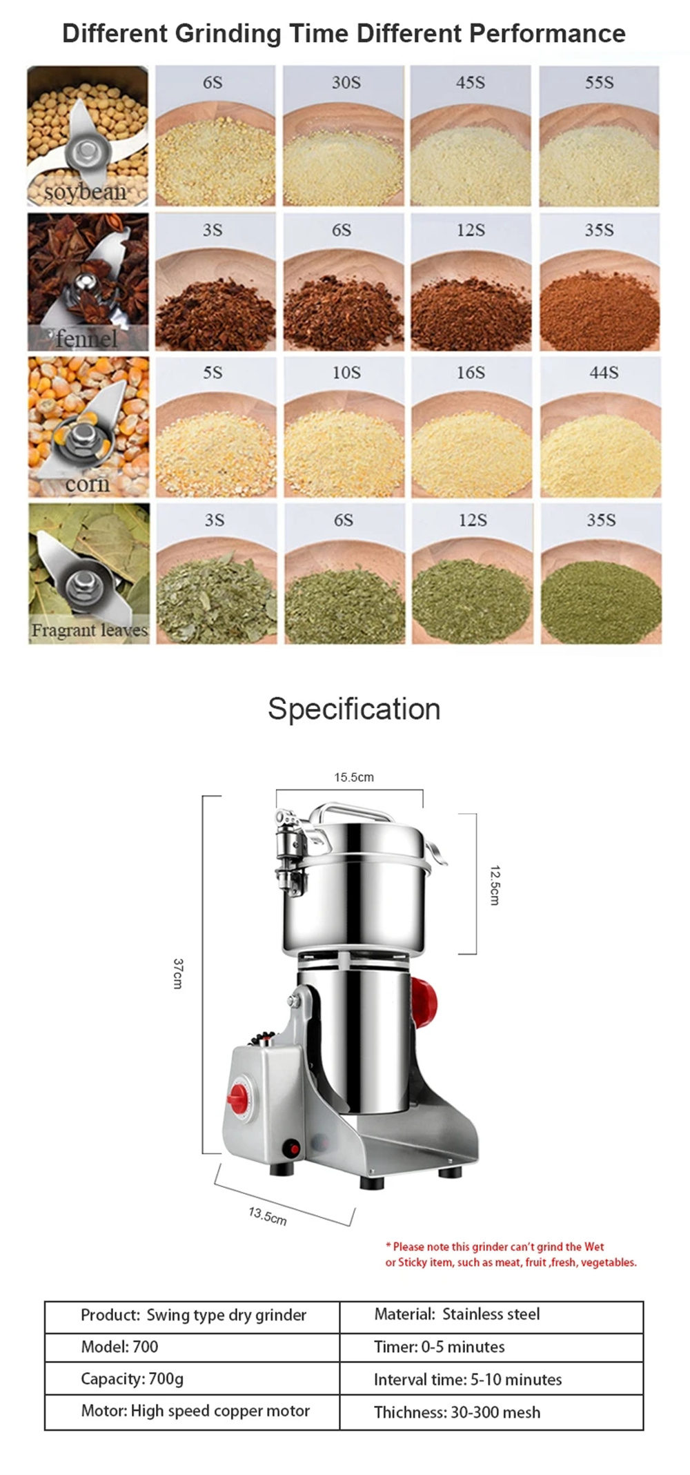 Brändi: BioloMix Tuote: 700g Grinder Teho: 2500W Virtalähde: sähkö Materiaali: ruostumaton teräs Jännite: 220~240V EU-pistoke Nopeus: 36000 (r/min) Jauhatuskarkeus: 30~300 seulaa |