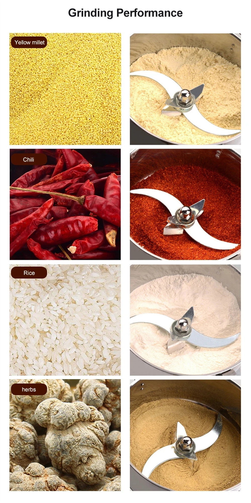 Sopii viljoille (soija, maissi, ohra, riisi, vehnä, mung-pavut, kahvipavut), mausteille (tähtianis, fenkoli, pippuri, rosmariini), yrteille sekä seesamille, maapähkinälle ja saksanpähkinälle. Käytä vain kuivattuja raaka-aineita. Varmista, että jauhettava materiaali peittää pitkän terän ja että täyttö on enintään 2/3 säiliöstä.