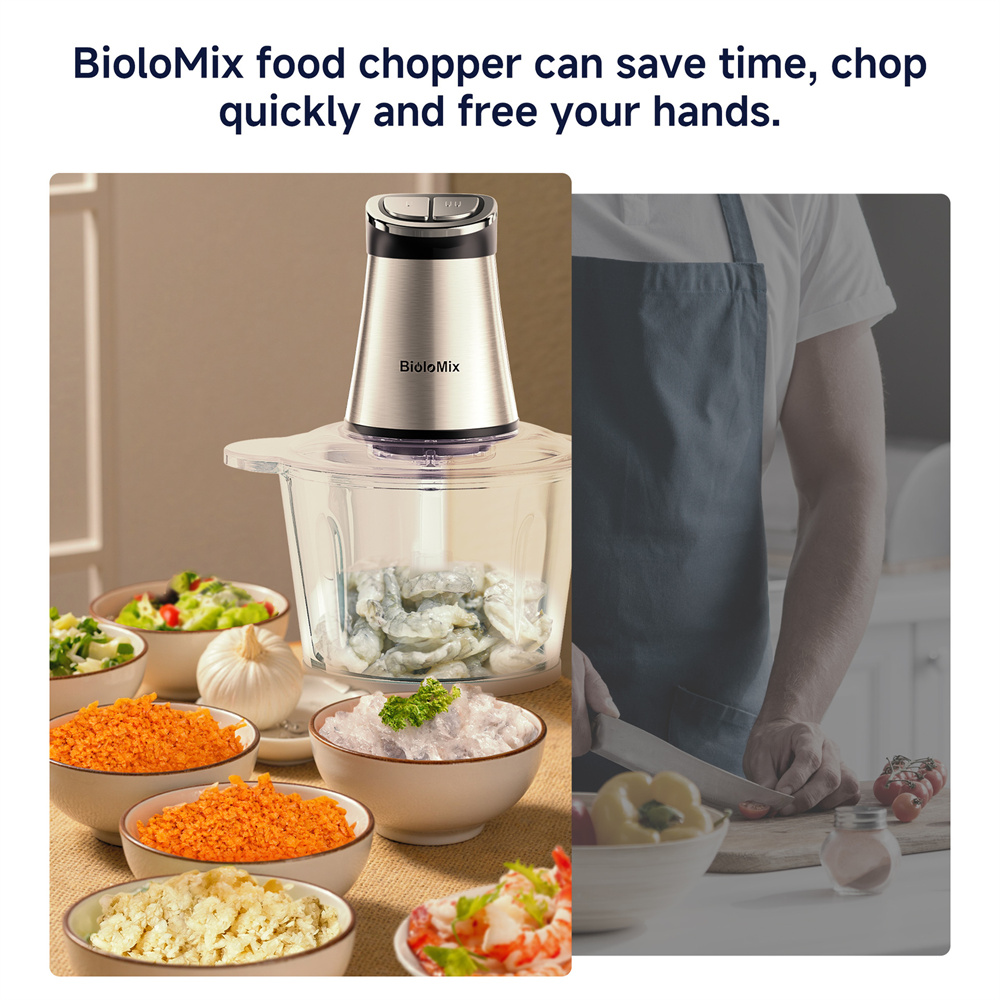 Kompakti ja monikäyttöinen BioloMix AMJ-501 -silppuri auttaa pilkkomaan, murskaamaan ja soseuttamaan ainekset nopeasti arjen ruoanlaittoon. Kaksinopeuksinen ohjaus, terävät 4-kerroksiset terät ja kaksi kulhoa (ruostumaton teräs ja paksu lasi) tuovat joustavuutta eri raaka-aineille.