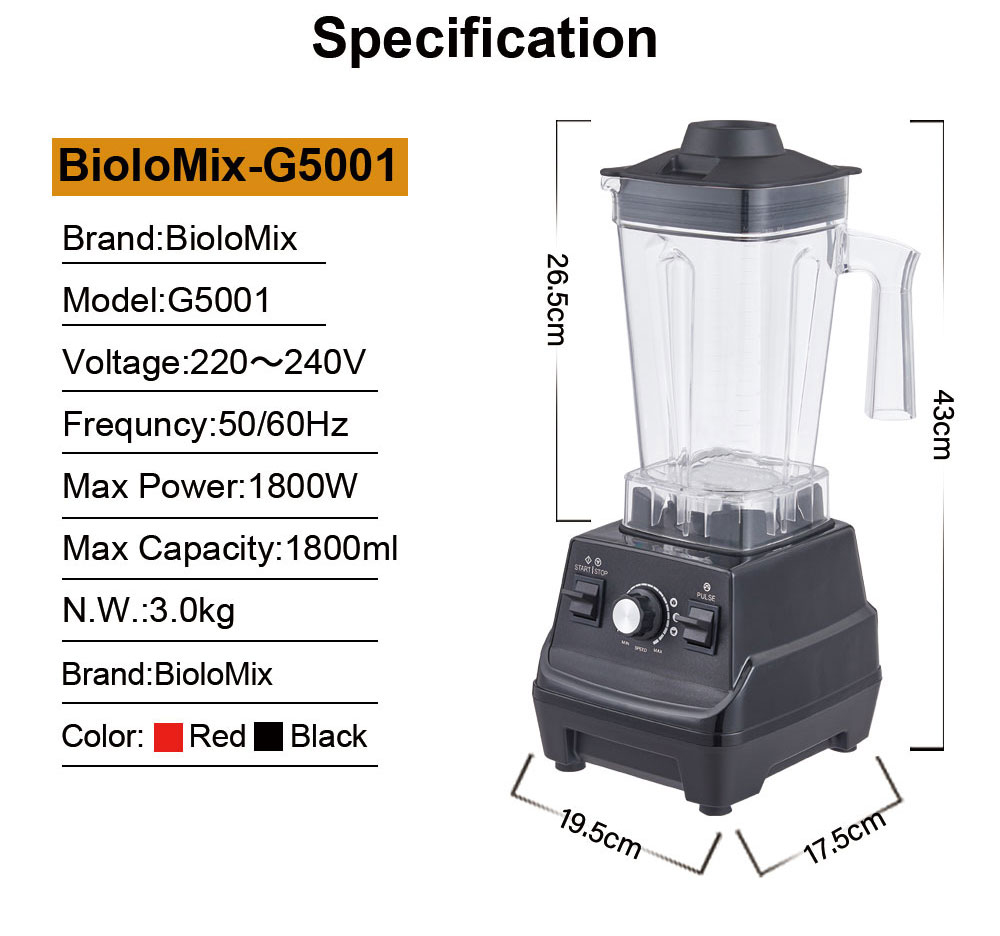 BioloMix minikokoinen tehosekoitin 1800W kaksikuppinen 1,8l+0,6l BPA-vapaa punamusta
