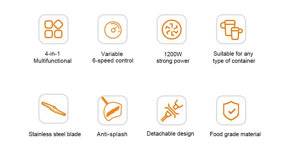 Tehokas 4 yhdessä -monitoimikäsisekoittaja päivittäiseen ruoanlaittoon. 1200W moottori ja 2 terävää 304-ruostumattomasta teräksestä valmistettua terää sekoittavat, pilkkovat ja vaahdottavat tasaisesti – sopii esimerkiksi vauvanruokiin, keittoihin, mehuihin ja smoothieihin.