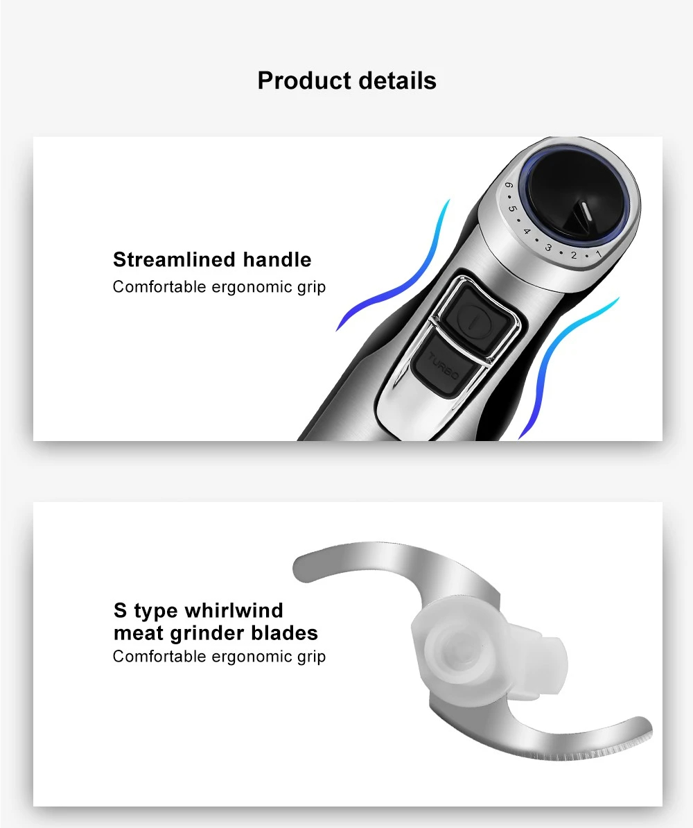 - Helppo käyttää ja puhdistaa: irrotettava varsi, käsin huuhtelu tai yläkorin astianpesukoneessa, moottoriosaa ei saa upottaa veteen