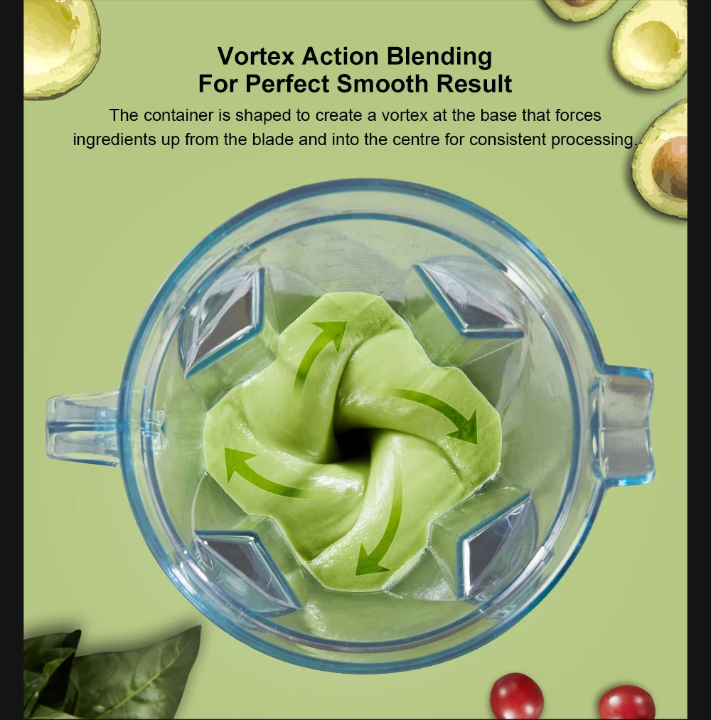 - Suuri BPA-vapaa kannu: 2L, kevyt ja kartiomainen muoto vetää ainekset tehokkaasti terille hienompaa seosta varten.