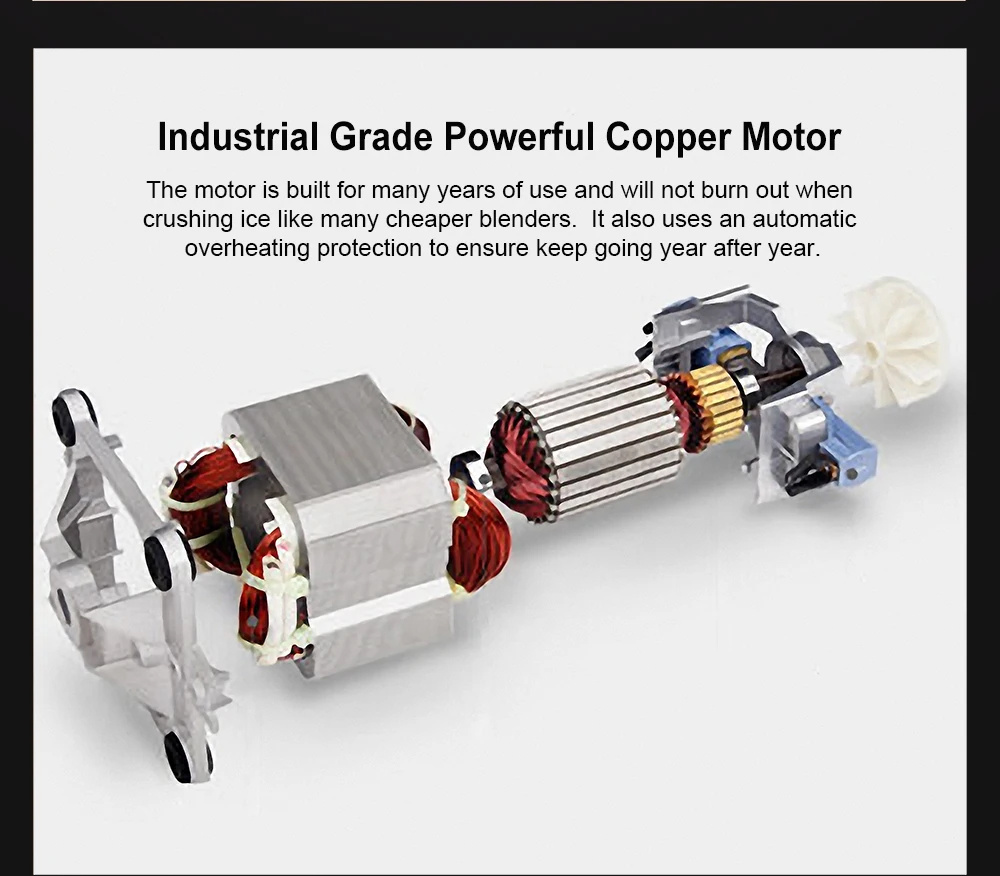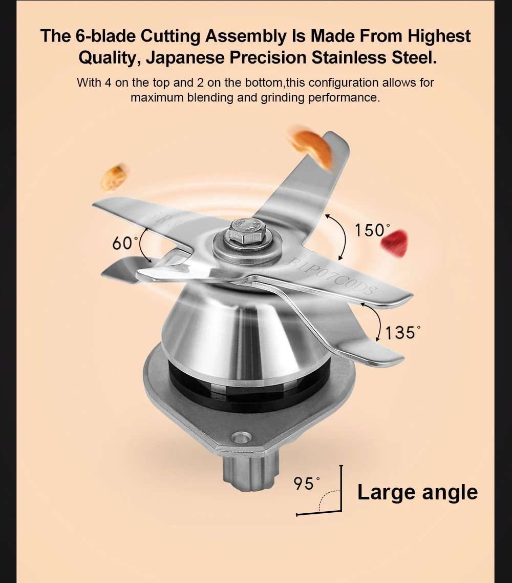 - Raskaan käytön teho: 2200W huipputeho ja 6 karkaistua ruostumattomasta teräksestä olevaa terää murskaavat jään, pakastehedelmät ja pähkinät tasaiseksi.