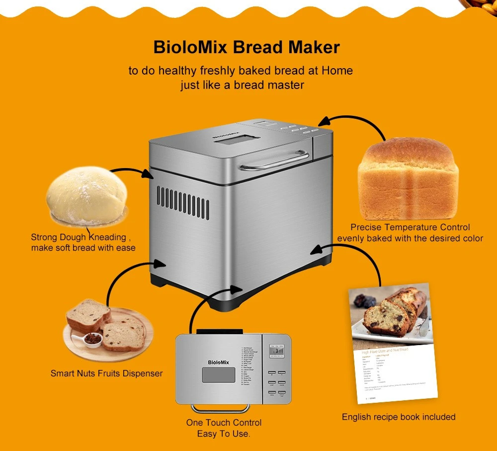 BioloMix BBM013 on ruostumattomasta teräksestä valmistettu leipäkone, jolla teet tuoretta leipää kotona helposti. 1KG kapasiteetti, 19 automaattiohjelmaa, 3 kuoren paistotason valintaa sekä hedelmä- ja pähkinäannostelija helpottavat käyttöä ja tuovat vaihtoehtoja arkeen.