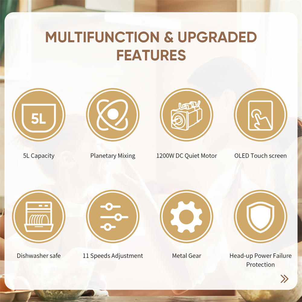 - 5 L kulho: ruostumatonta terästä, riittävä kapasiteetti perheelle tai isompiin leivontaeriin. Mukana taikinakoukku, litteä vispilä, vispilä ja roiske-/kaatosuoja. Irrotettavat osat ovat astianpesukoneessa pestäviä.