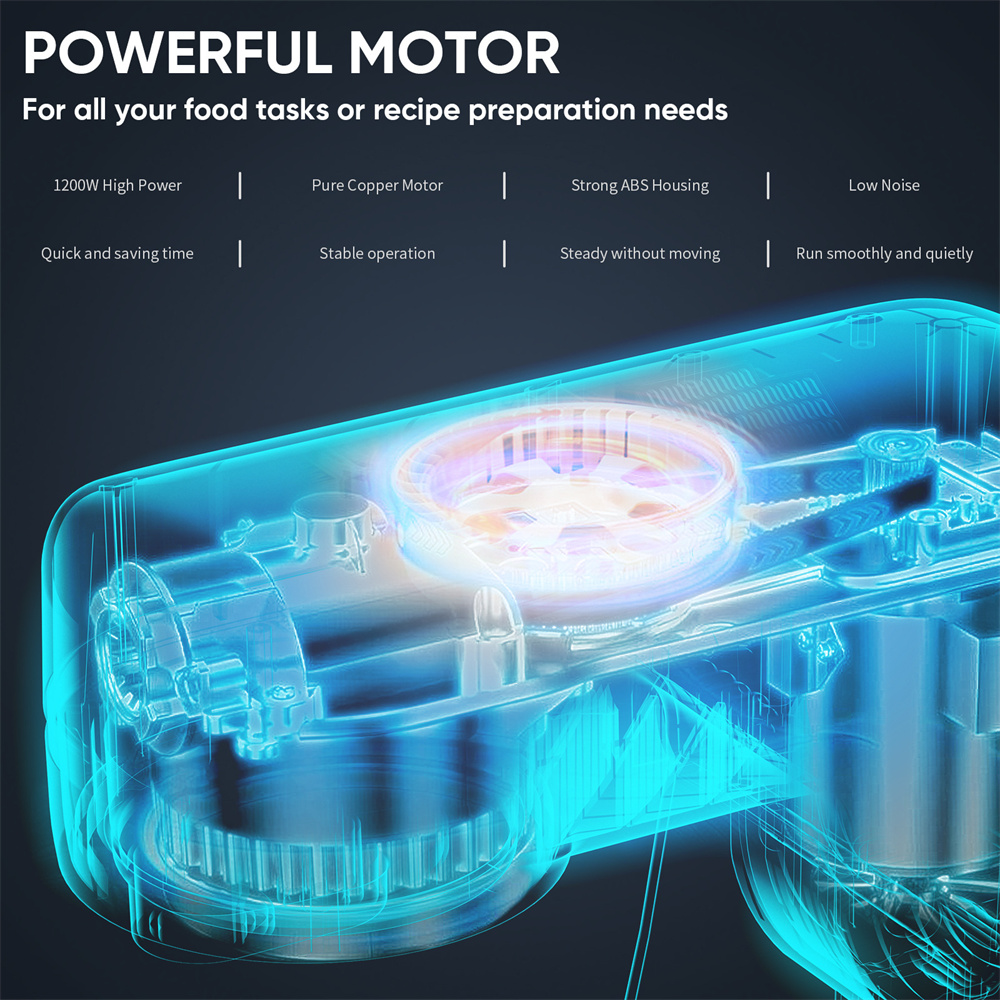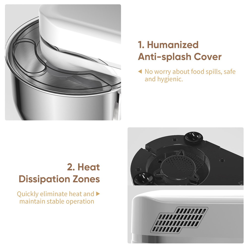 - Planetaarinen sekoitus: tasainen ja perusteellinen sekoitus. Kumiset imukuppijalat lisäävät vakautta.