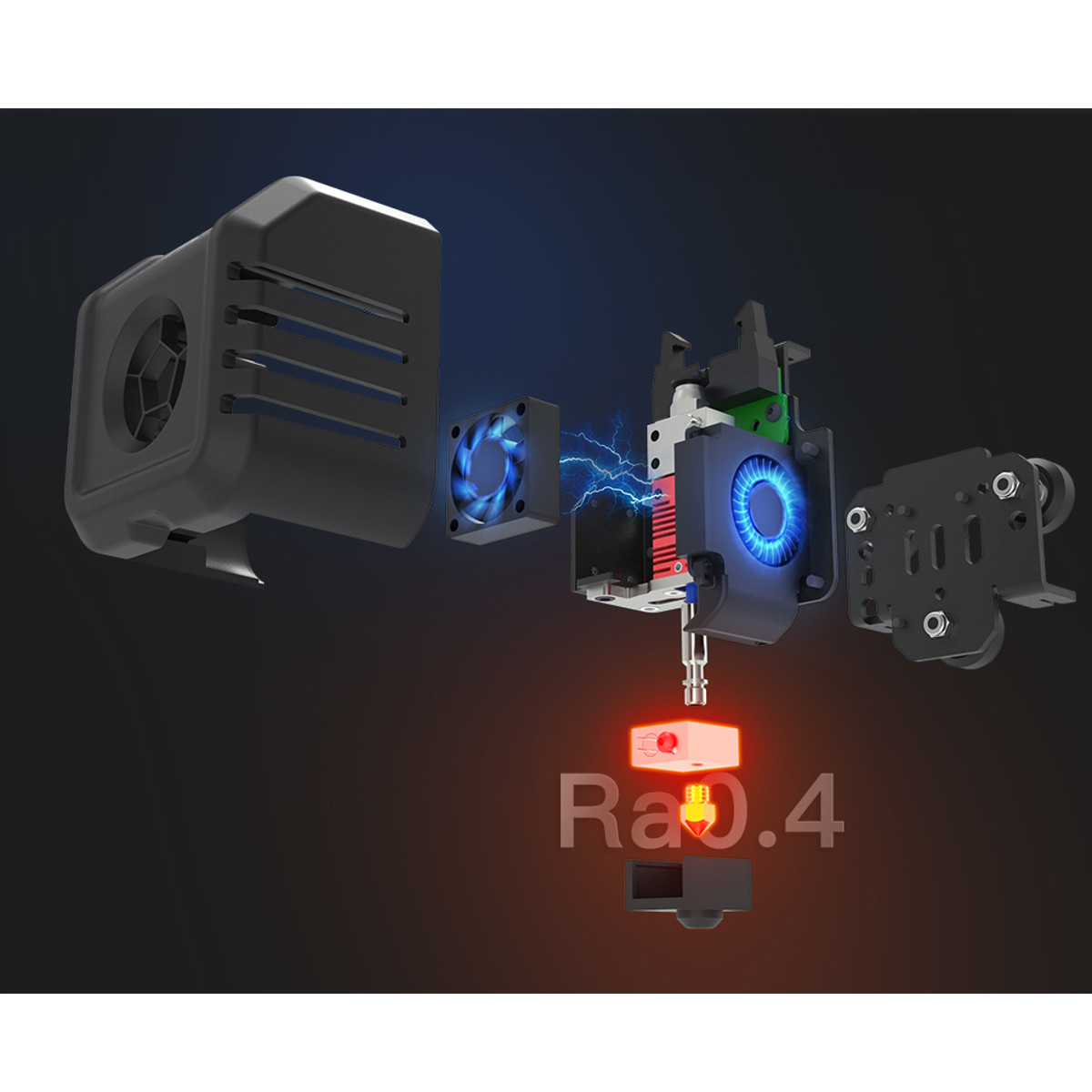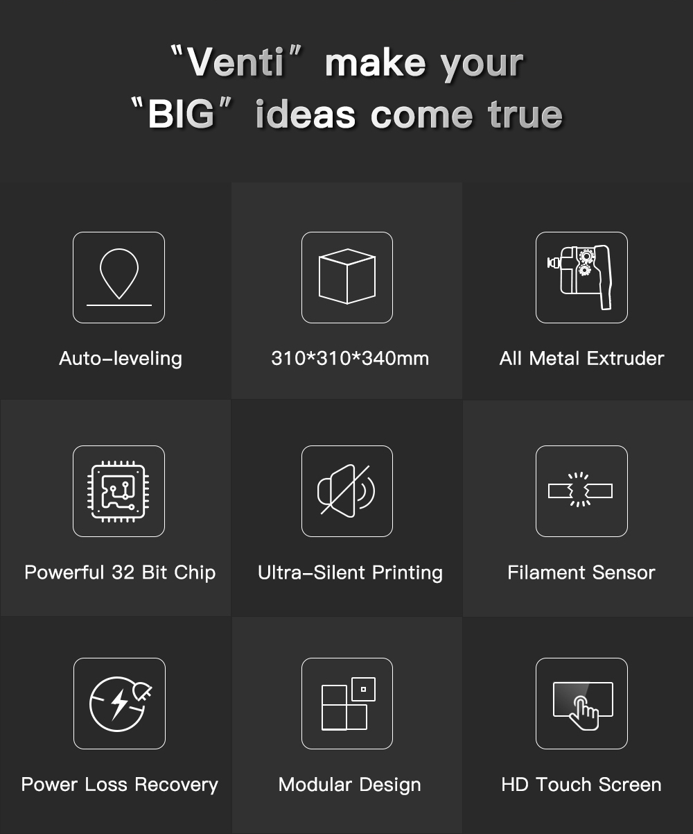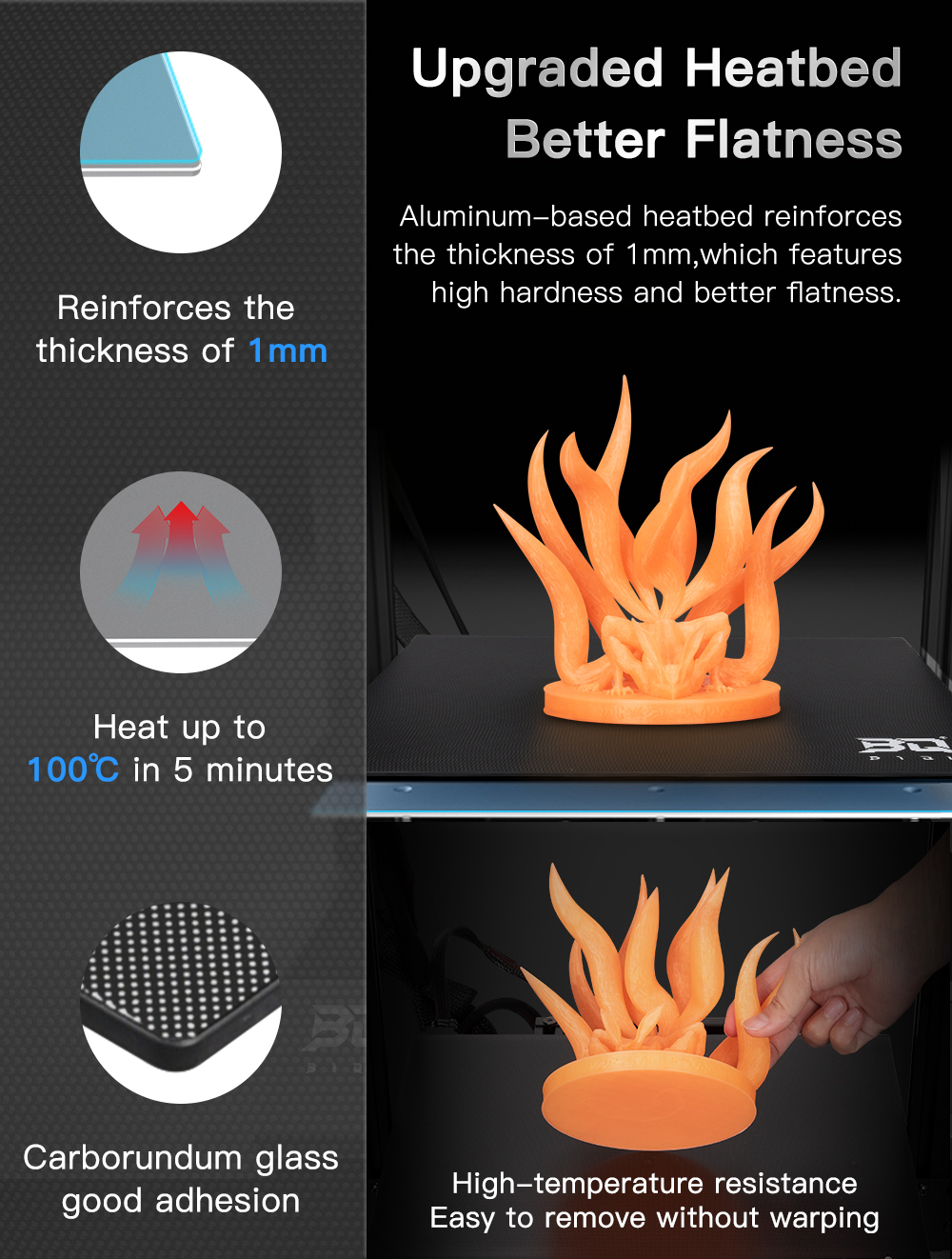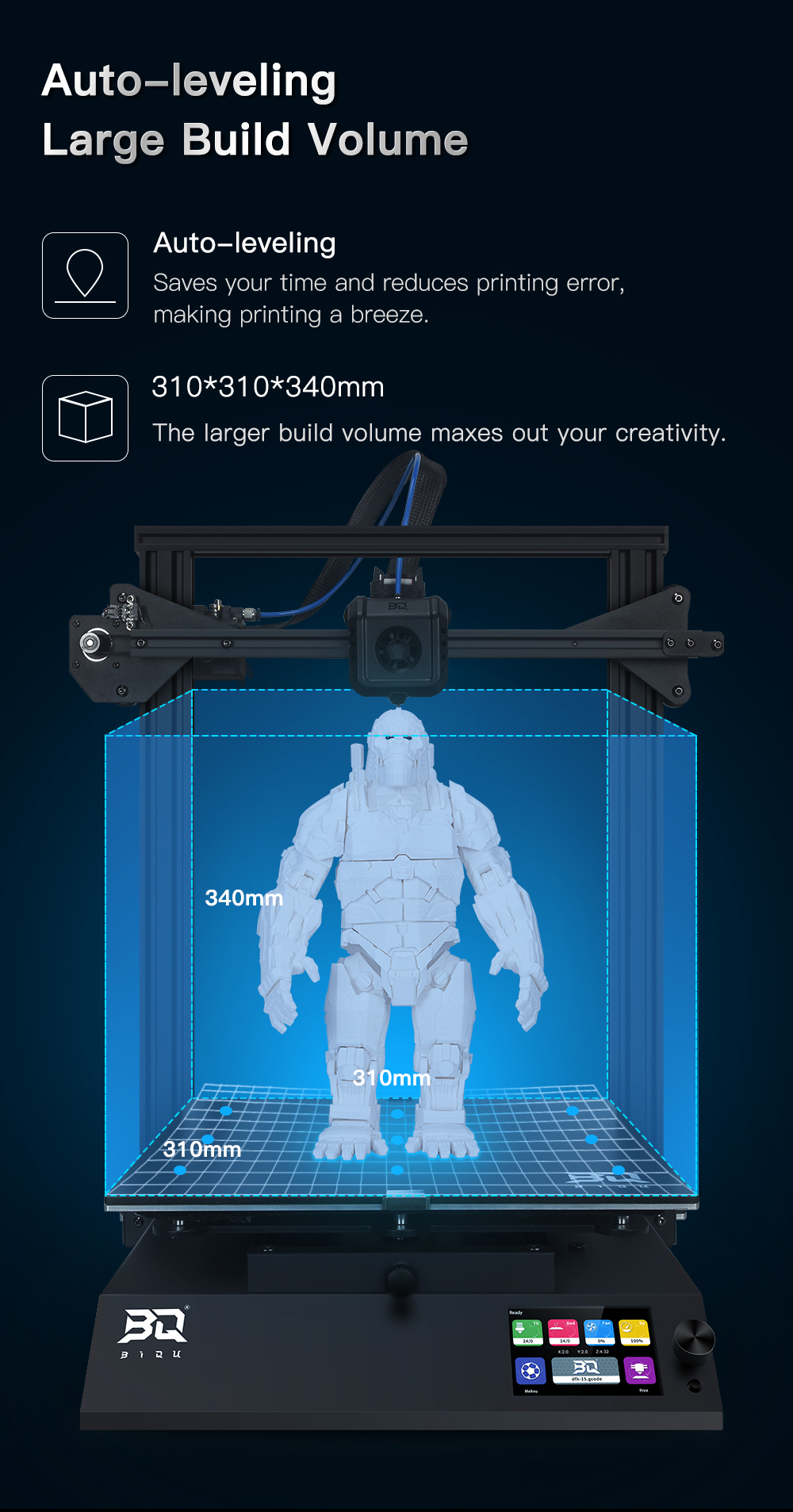 Induktiivinen tasoitus helpottaa käyttöönottoa ja parantaa tulostusvarmuutta. Suuri rakennustilavuus antaa enemmän liikkumavaraa luoville projekteille ja prototyypeille.