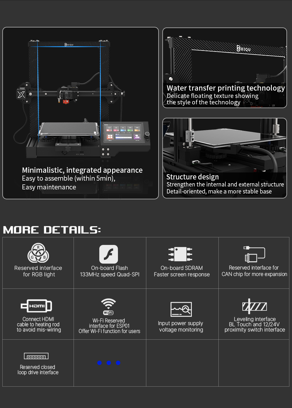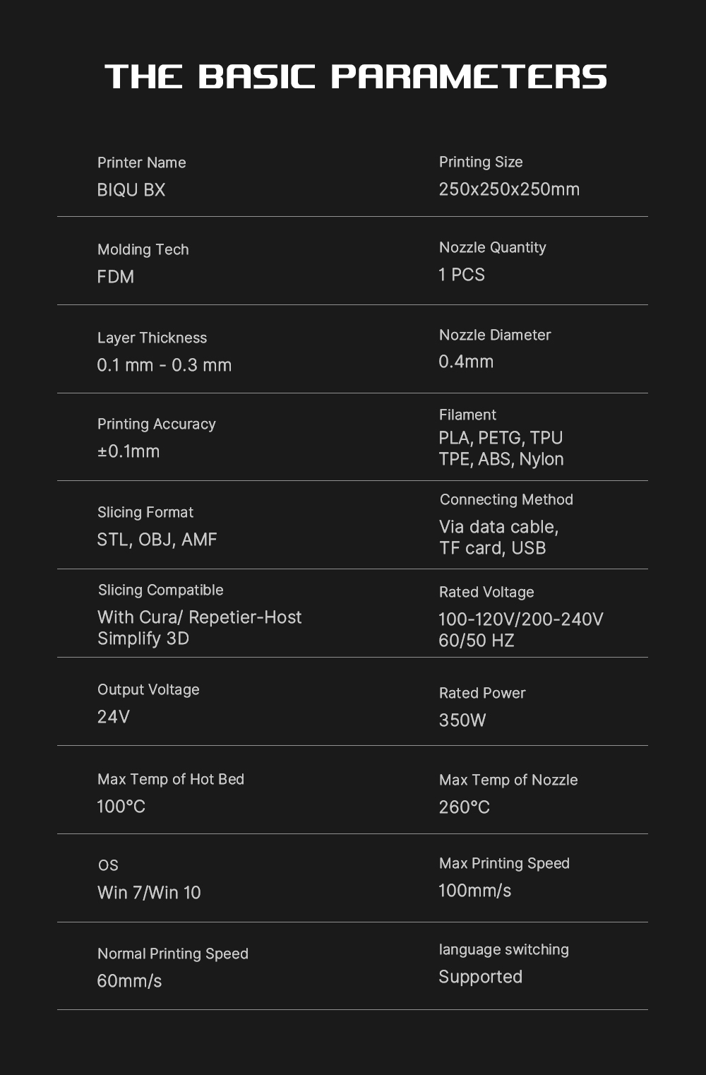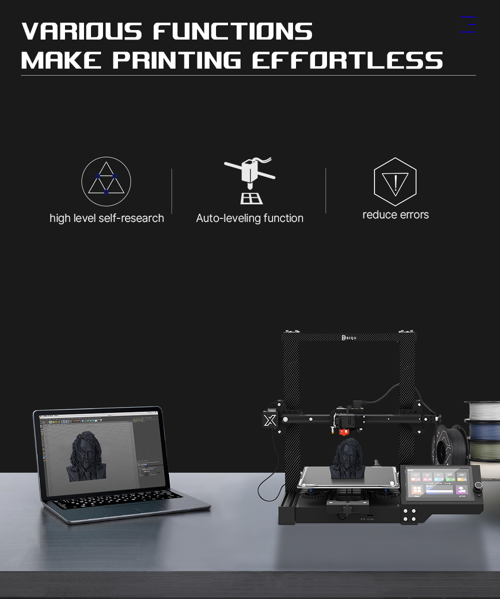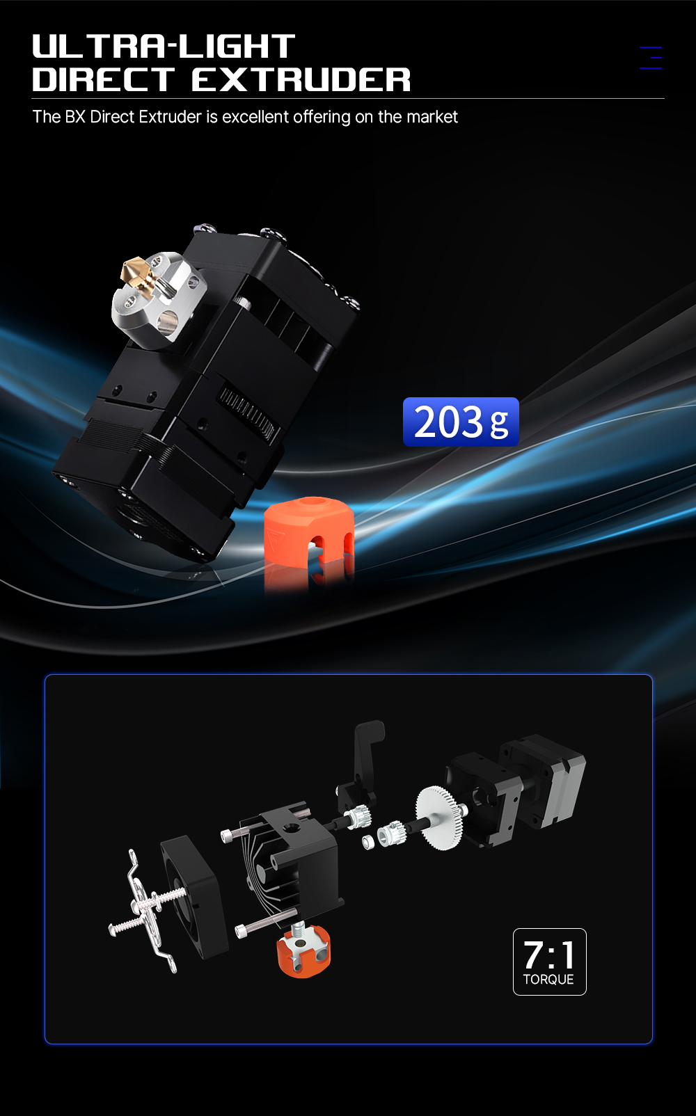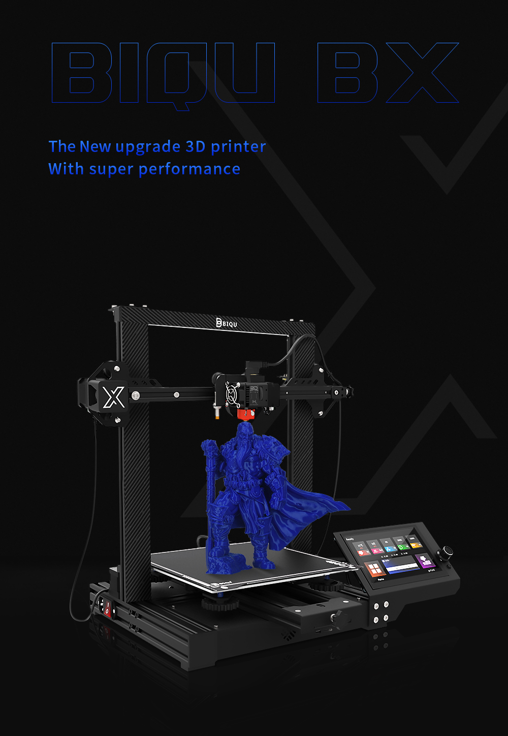 BIQU BX on FDM-3D‑tulostin, joka yhdistää 32-bittisen ohjauksen, kevyen H2 Direct Extruder -ekstruuderin ja suuren TFT70-kosketusnäytön. Tulostin tukee suoraan OctoPrintiä Raspberry Pi -yhteyden kautta ja sisältää turvallisen Mean Well -virtalähteen.