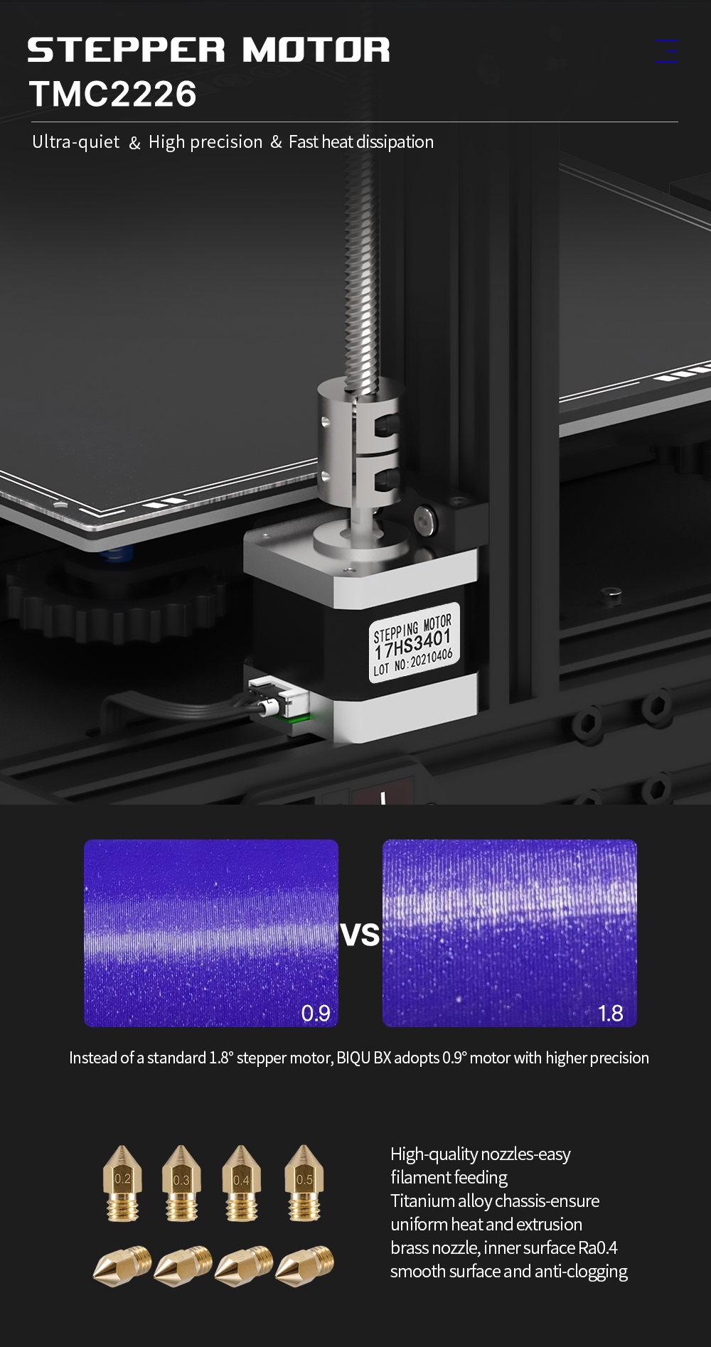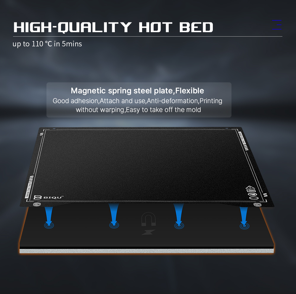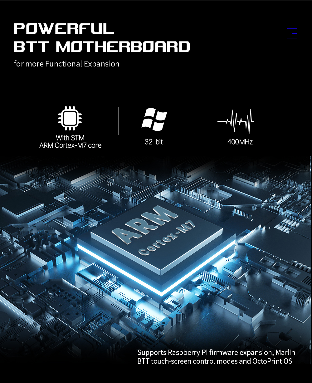 BIQU BX käyttää sisäänrakennettua SKR SE-BX V2.0 32-bittistä hiljaista emolevyä, jossa on tuotu ARM Cortex 400MHz -prosessori ja suurikapasiteettinen flash-muisti. Tulos: ohjausjärjestelmän nopeampi toiminta, herkkä reagointi, korkeampi tulostustarkkuus ja turvallinen lämpökarkaamisen suojaus.