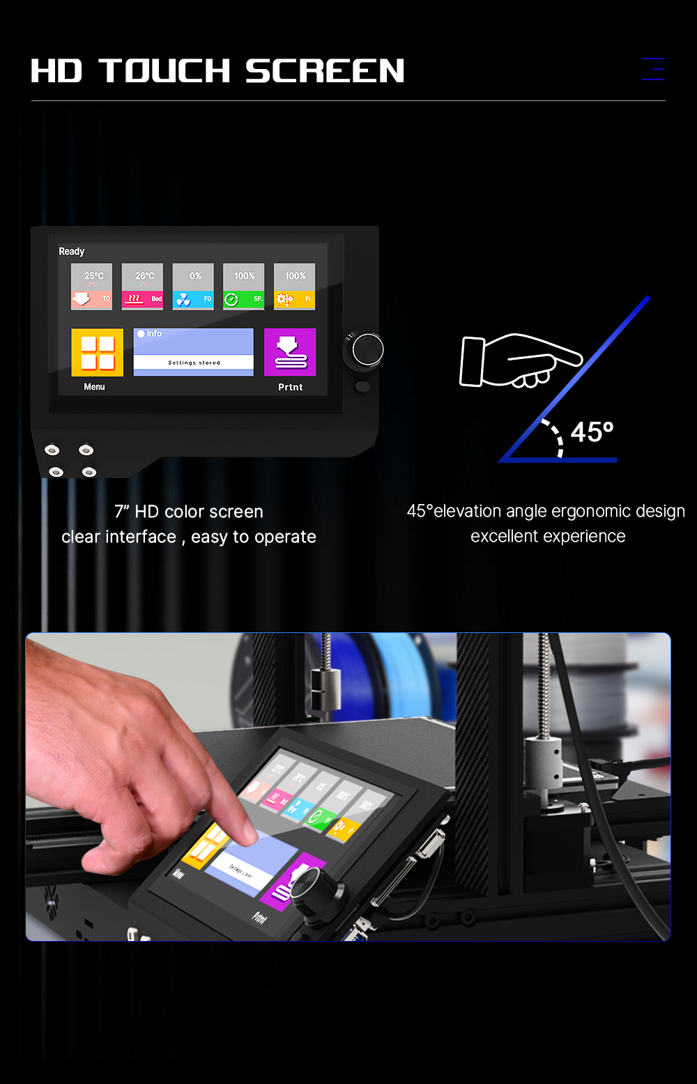 Suuri TFT70-kosketusnäyttö tukee kolmea tilaa: kosketusnäyttötila, Marlin ja OctoPrint. Tilojen välillä voi vaihtaa yhdellä painikkeella.