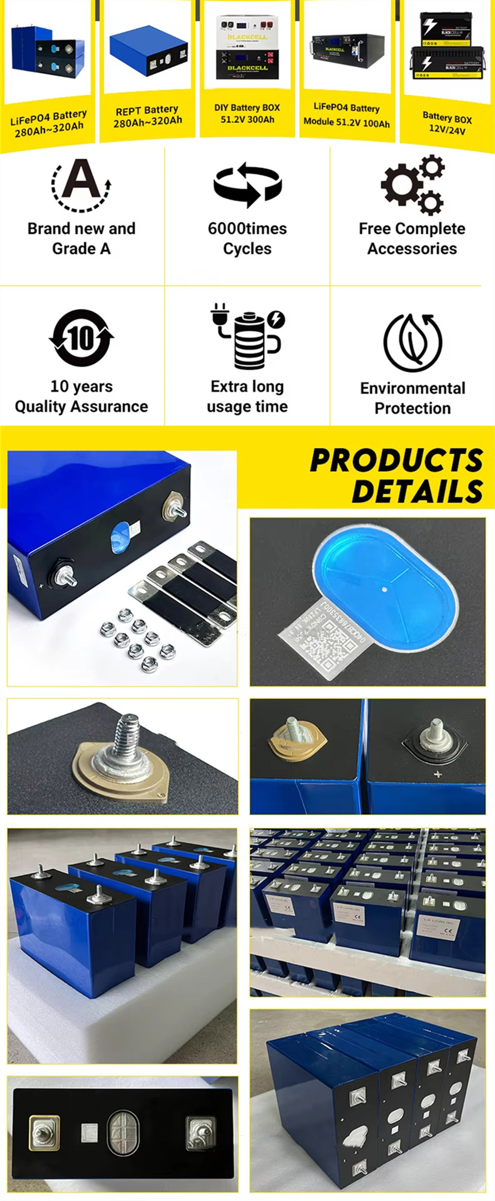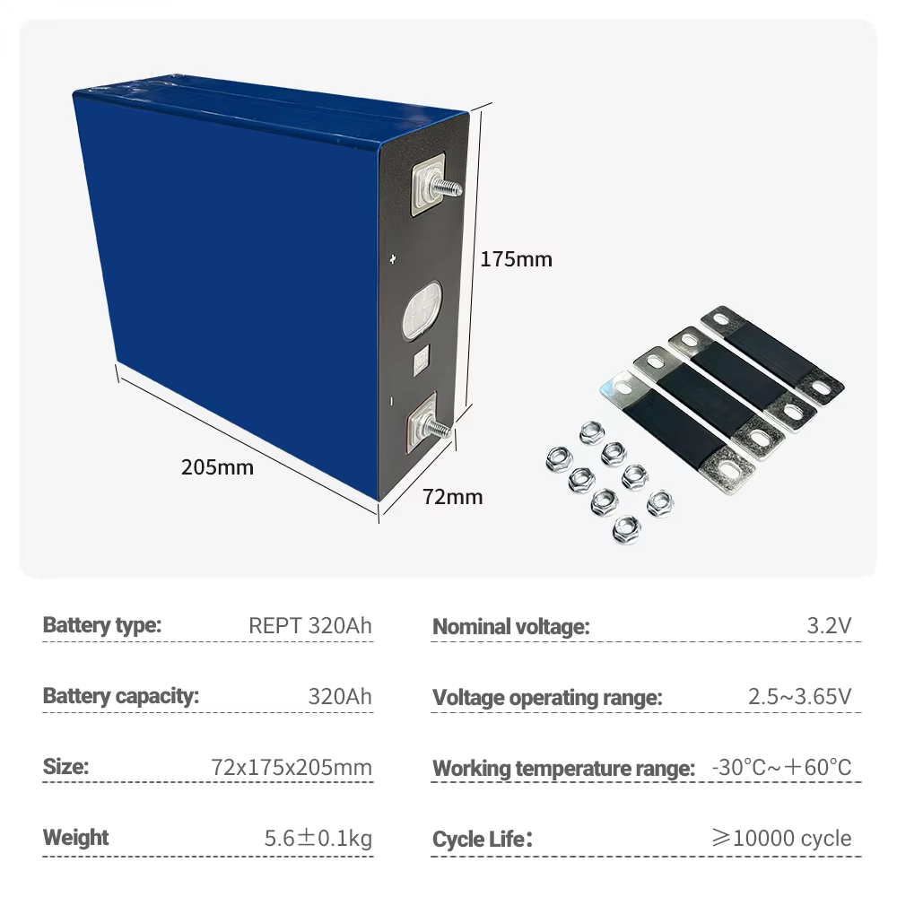Blackcell REPT 320AH -akut tarjoavat suuren kapasiteetin ja pitkän käyttöiän vaativiin energiaratkaisuihin. Yksi akku on 3.2V ja sen käyttöjännitealue on 2.5~3.65V. Laaja käyttölämpötila-alue ja kompakti koko tekevät niistä sopivia monenlaisiin projekteihin.