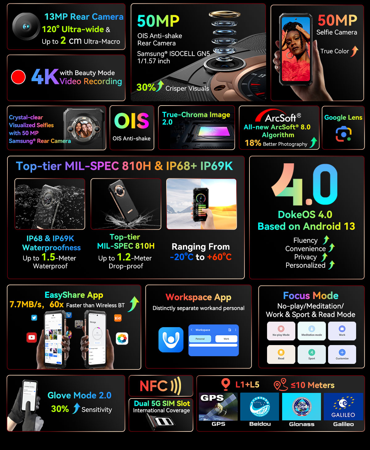 Wi‑Fi: Wi‑Fi 6, 2.4/5GHz (802.11a/b/g/n/ac/ax) VoLTE: tuki Bluetooth: BT5.1 Paikannus: GPS + Beidou + Glonass + Galileo Anturit: etäisyysanturi, valoisuusanturi, G-sensori, gyroskooppi, magneettinen anturi, ilmanpaineanturi, Coulomb-laskuri, sormenjälki, NFC, OTG FM-radio: kyllä Kestävyys: roiske-, vesi- ja pölytiivis, IP68 & IP69K & MIL-STD-810H |