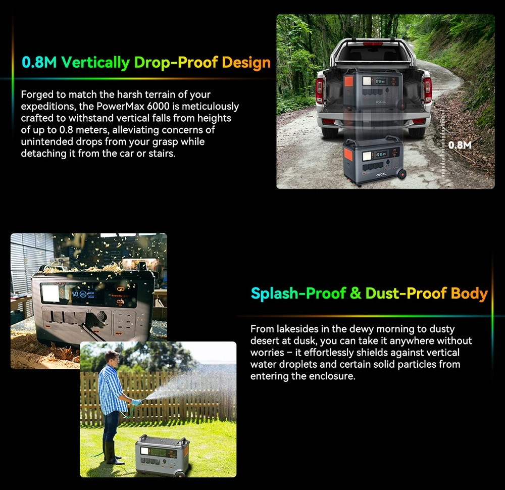 [0.8M pudotuskestävä rakenne] PowerMax 6000 on suunniteltu kestämään vaativissa maastoissa ja se on rakennettu kestämään pystysuoria pudotuksia jopa 0.8 metrin korkeudesta. Tämä vähentää vahinkoriskiä, jos laite lipsahtaa otteesta esimerkiksi autosta irrotettaessa tai portaita kannettaessa.